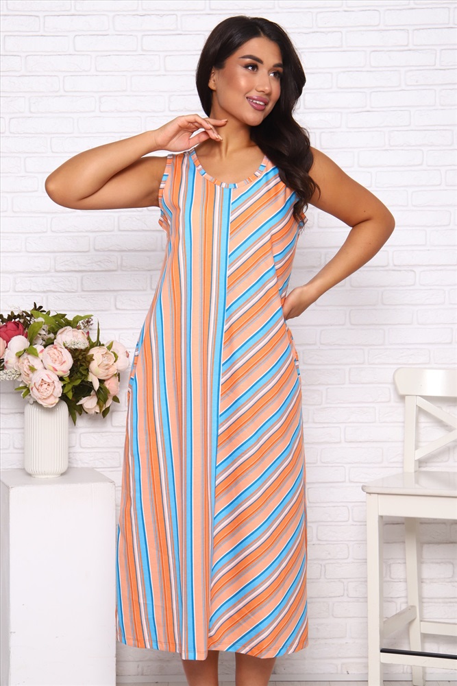 Застежка: без застежки Сарафан женский выполнен из трикотажного полотна кулирка. Сарафан свободного силуэта, по низу изделия выполнены разрезы. Горловина и пройма окантованы.