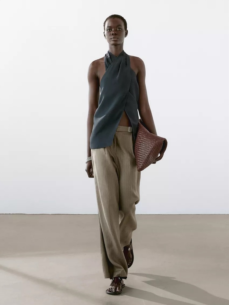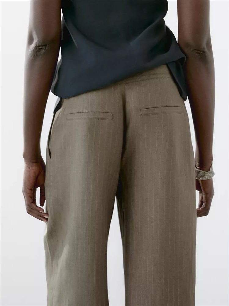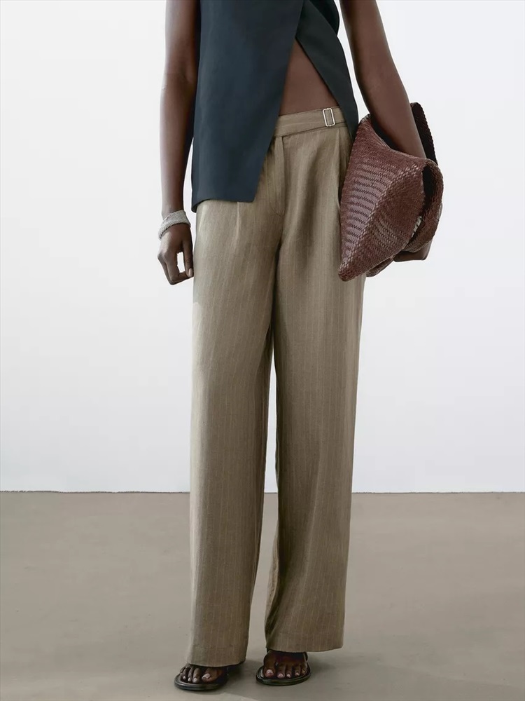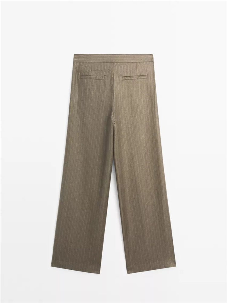 100% linen striped trousers with buckle detail