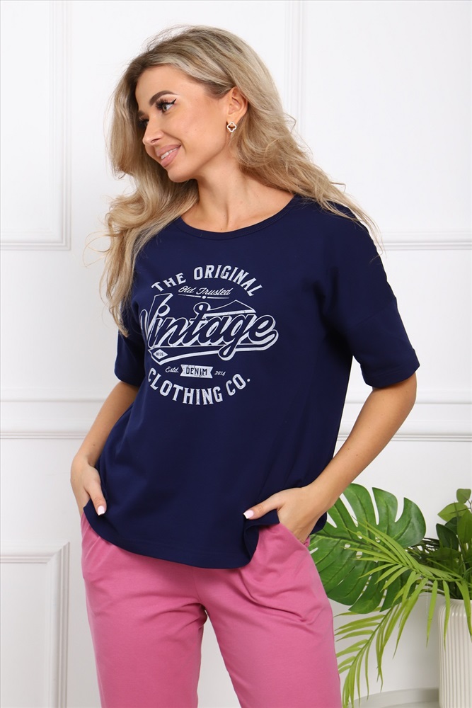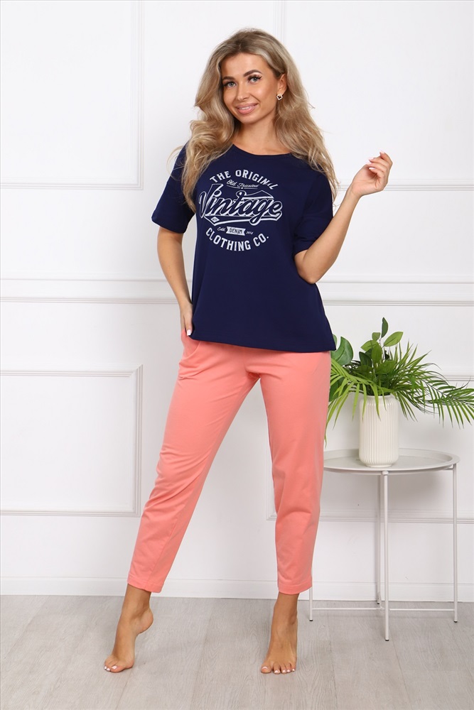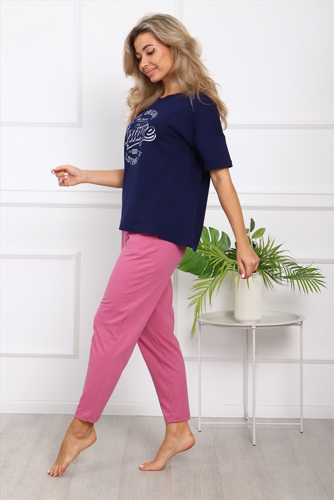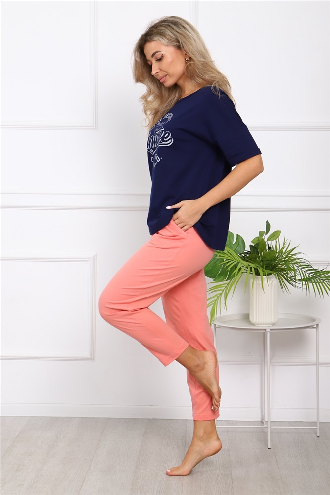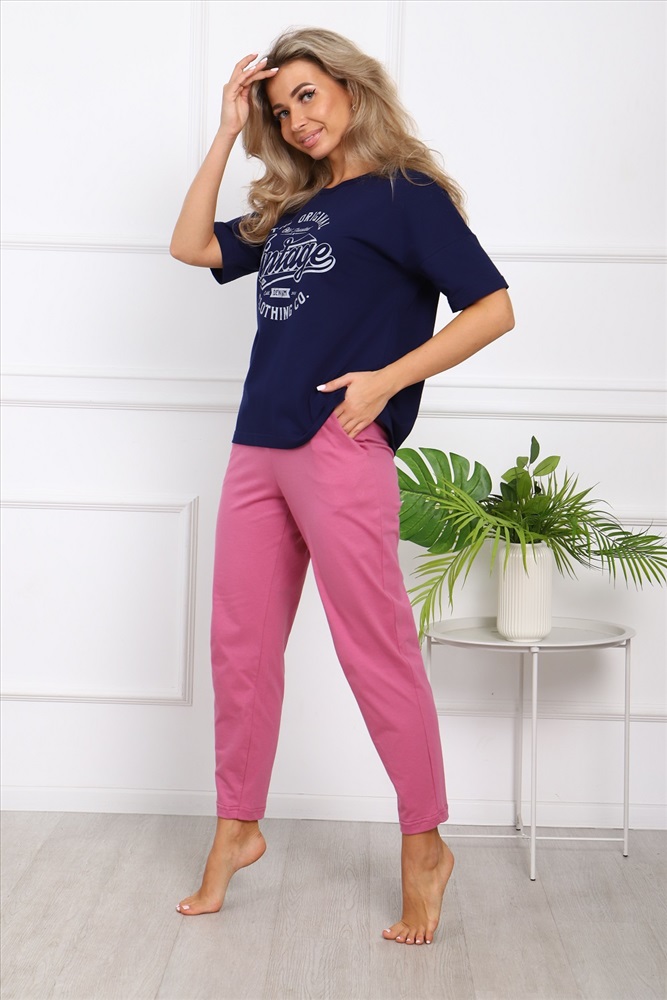 Застежка: без застежки Пижама женская: футболка с короткими рукавами с принтом на полочке, брюки разных расцветок с боковыми карманами.