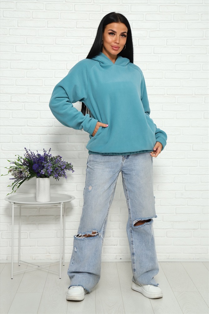 Застежка: без застежки Толстовка женская из флиса, с капюшоном, с боковыми карманами, рукава реглан, низ изделия и низ рукавов - на резинке. Может составить комплект с брюками, артикул 1027.