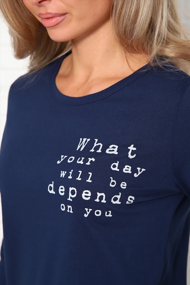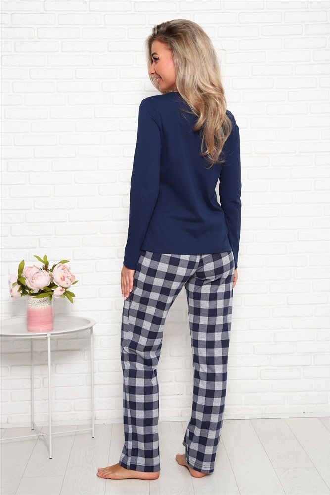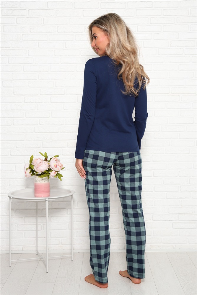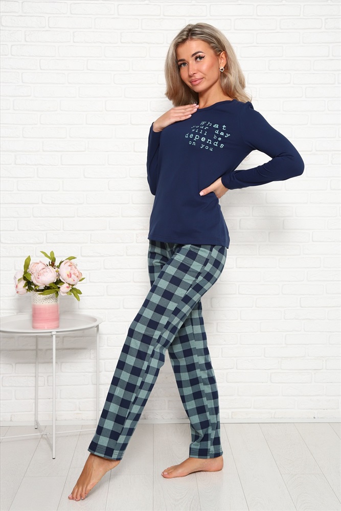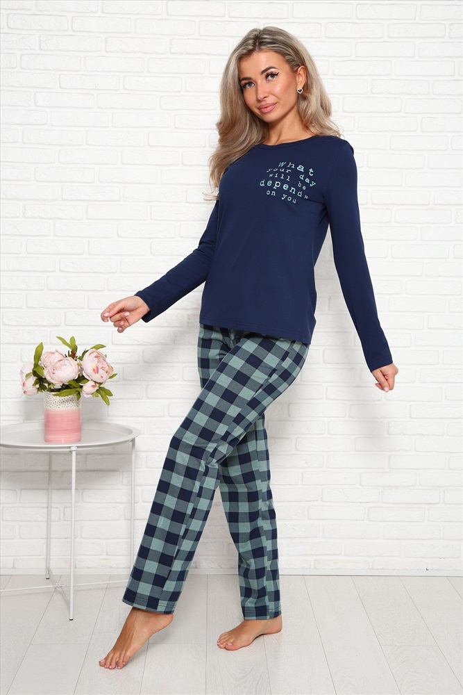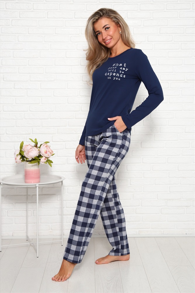 Застежка: без застежки Комфортная и стильная женская пижама. Брюки в клетку с двумя боковыми карманами, на эластичном поясе и футболка с длинным рукавом, с печатью на полочке.