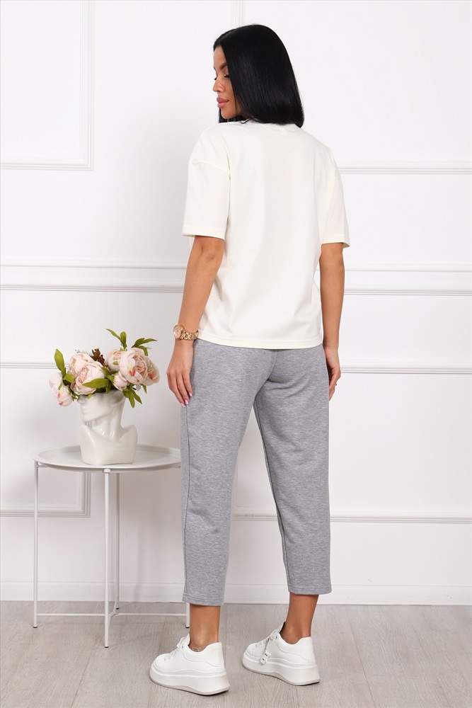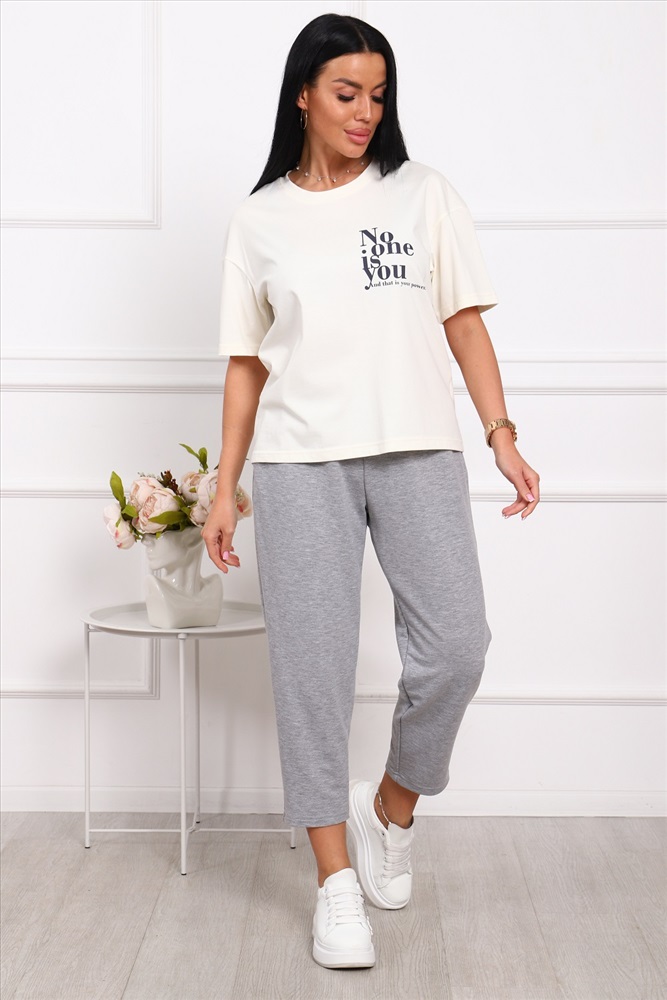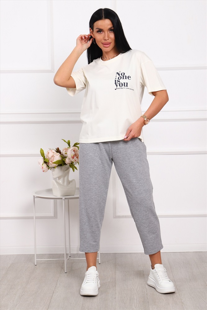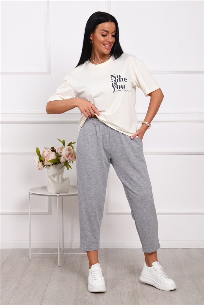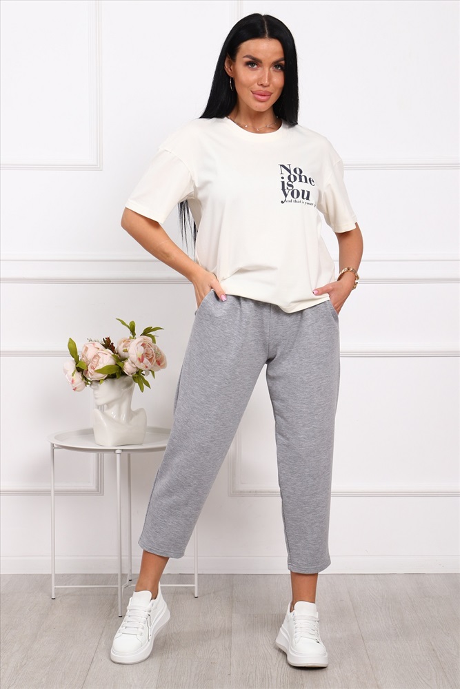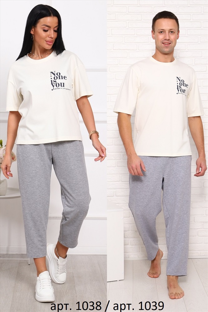 Состав: 95% ХБ 5% лайкра; 74% хб 21% ПЭ 5% Лайкра Модель: 1038 Костюм Тип товара: костюм с брюками Материал: кулирка пенье | футер 2-х нитка | футер 2-х нитка | кулирка пенье Бренд: ИП Кичемаев С.К. Длина: укороченный Карман: боковые Назначение: для дома НДС: 5% Особенности: на резинке Отделка: с карманами | с печатью Посадка: высокая посадка Рисунок: надпись Рукав: короткий рукав Сезонность: лето | осень | весна | зима Силуэт: прямой | свободный Стиль: домашний Воротник: без воротника Застежка: без застежки Костюм женский: футболка свободного кроя, с короткими рукавами и с лаконичным принтом на груди; брюки укороченные с боковыми карманами, на эластичном поясе. Данный костюм вместе с мужским костюмом (арт. 1039) составляет образ Family look. Таблица размеров и весафутболка