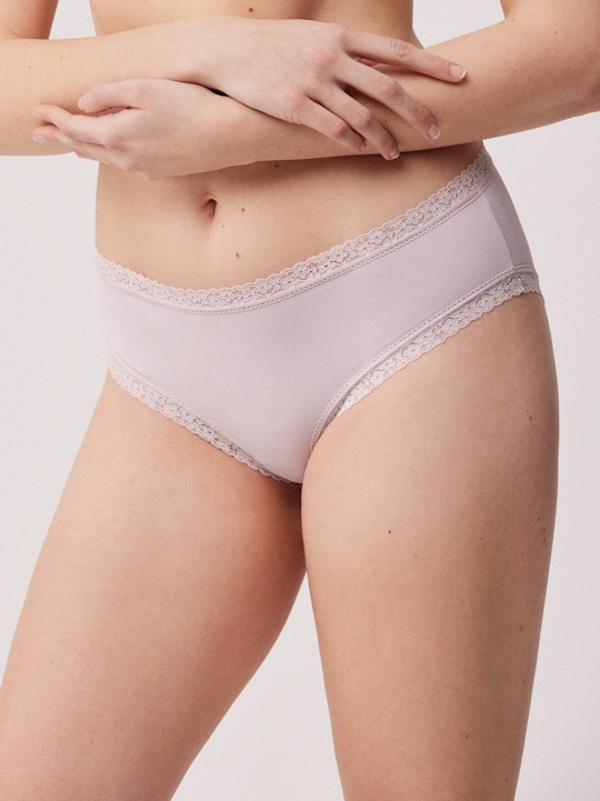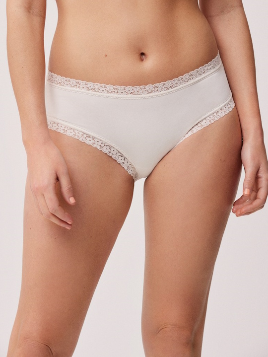 Состав: 90% полиамид, 10% эластан Трусы слипы средней посадки с широким боком. Трусики гладкие, декорированы узкой кружевной каймой. Комментарии к товару
