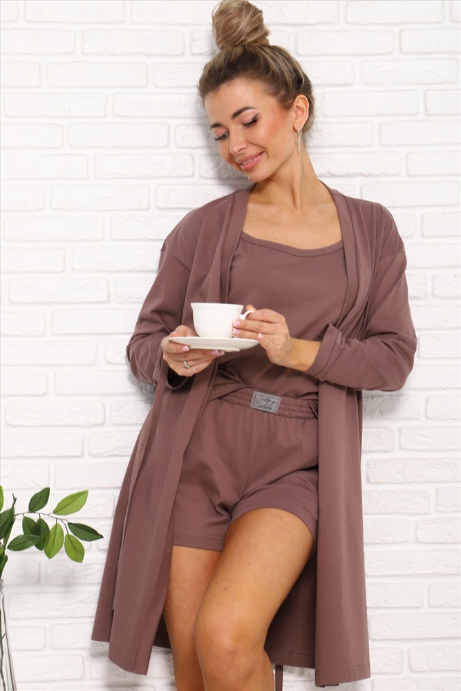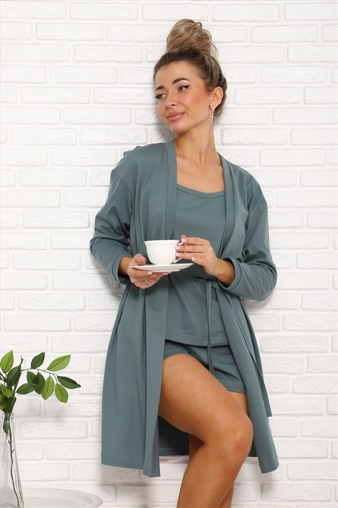 Состав: 100% ХБ Модель: 1055 Костюм тройка Тип товара: костюм с шортами Материал: кулирка | кулирка Бренд: ИП Кичемаев С.К. Карман: боковые Назначение: для дома НДС: 5% Особенности: на резинке Отделка: с карманами | с поясом Посадка: высокая посадка Рейтинг: Рейтинг 4 и выше Рисунок: однотонные Рукав: без рукава | длинный рукав Сезонность: лето | осень | весна | зима Силуэт: прямой | свободный Стиль: домашний | пляжный | повседневный Воротник: без воротника Застежка: без застежки | пояс Костюм женский тройка летний - для дома, отдыха, пляжа. Костюм состоит из трех изделий: 1 - топ на брительках; 2 - шорты на эластичном поясе, с боковыми карманами; 3 - кардиган запашной, с поясом, с длинными рукавами. Комфорт 100% хлопка, благородные цвета, стильный силуэт. Таблица размеров и весатоп