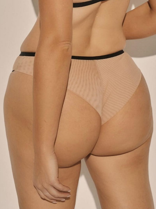 Шикарные трусики бразильяно бежевого цвета, выполнены из невидимой сетки с нежной черной вышивкой. Утонченная элегантность и максимальный комфорт, идеально подходят для женщин, которые ценят стиль и комфорт. Задняя часть трусиков выполнена из двойного тюля, благодаря чему она не выделяется под одеждой.