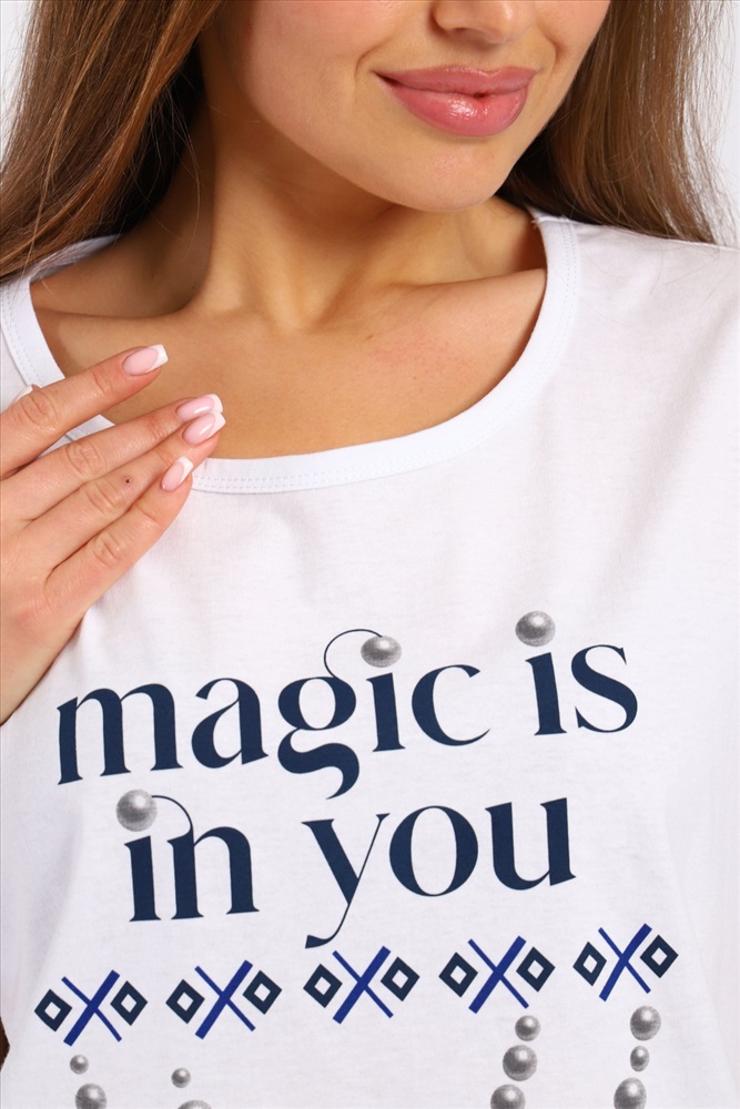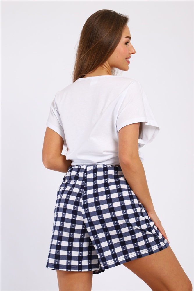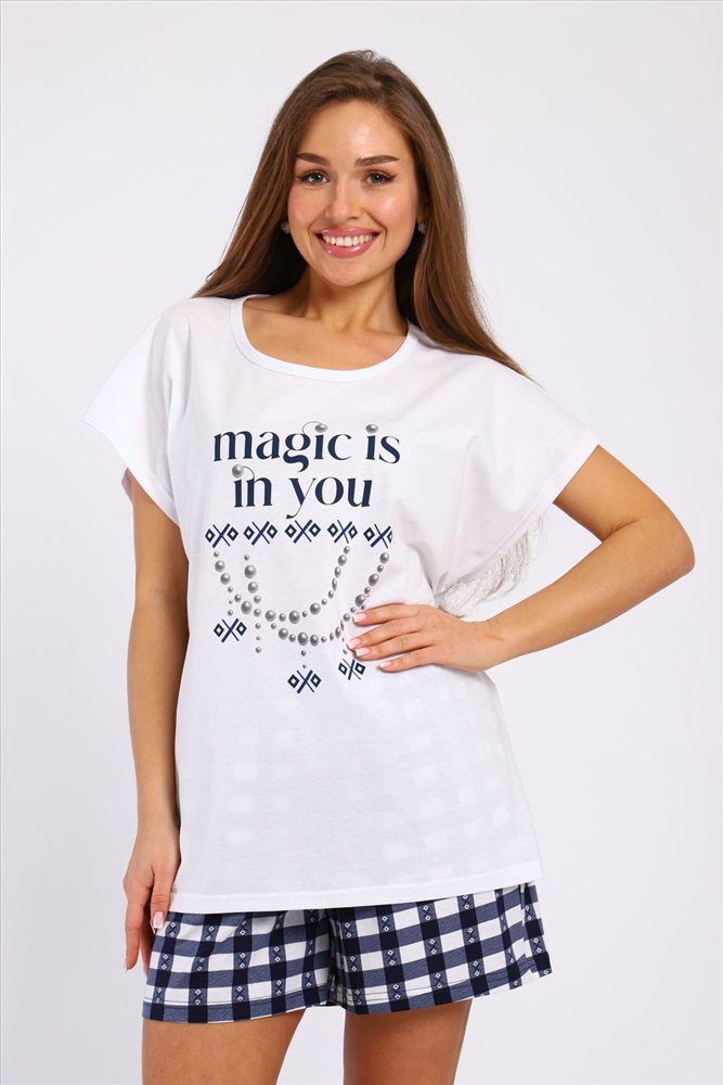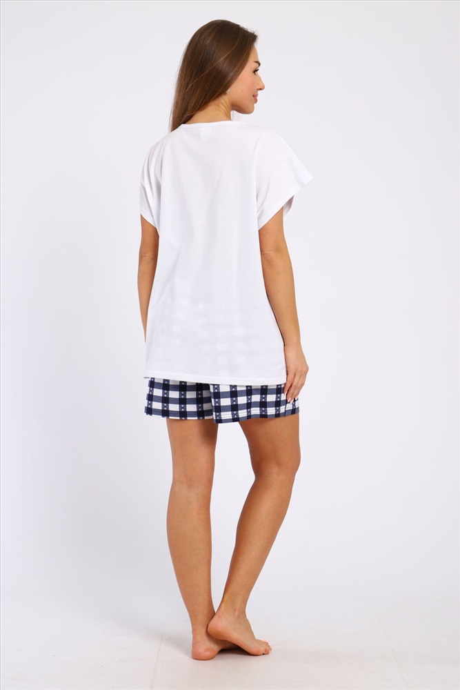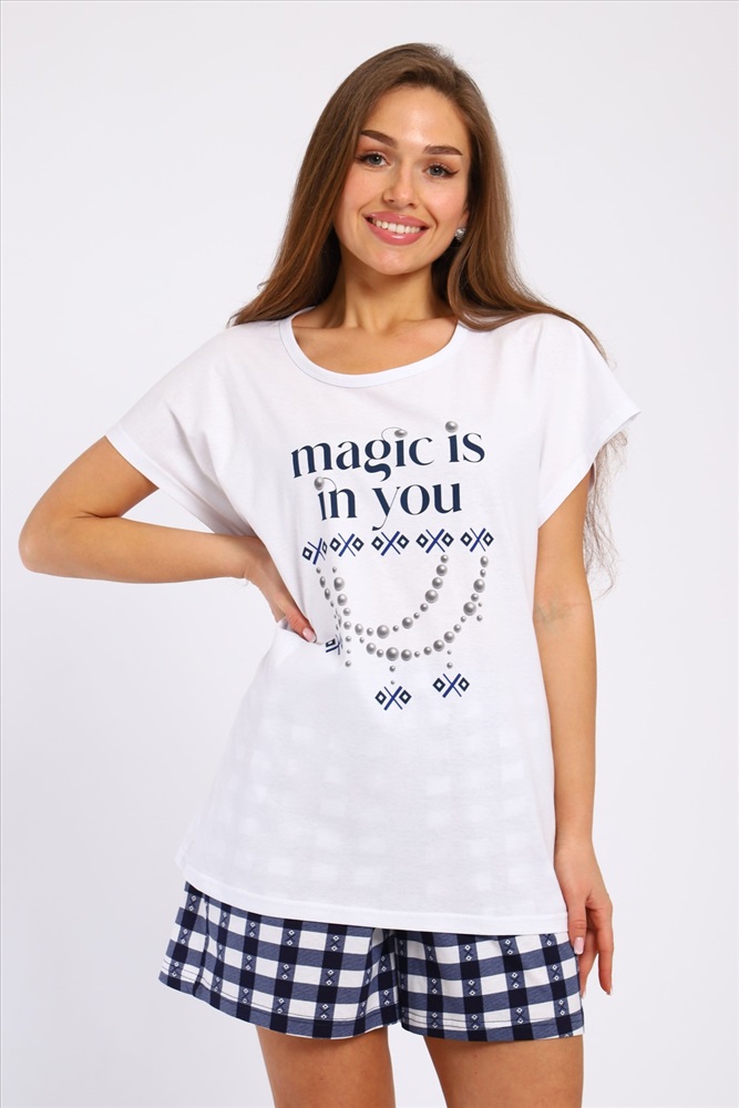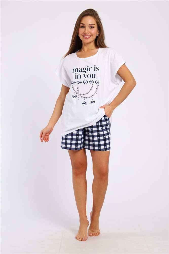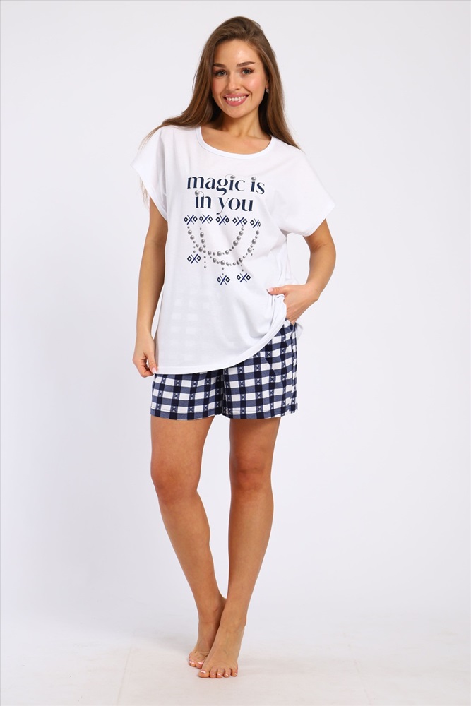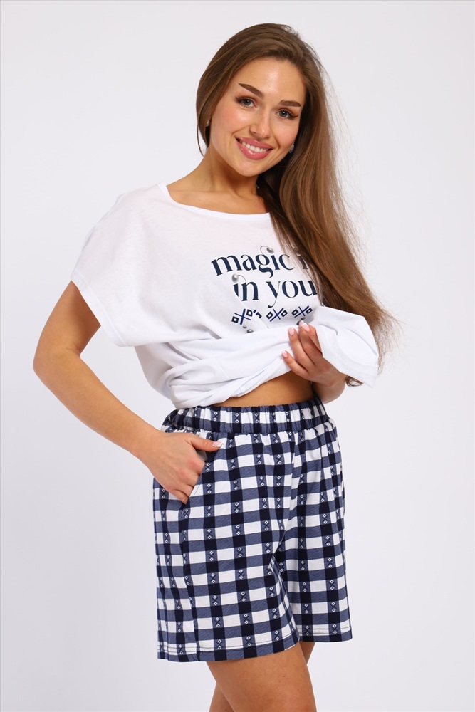 Застежка: без застежки Костюм с шортами выполнен из трикотажного полотна кулирка. Костюм состоит из футболки и шорт. Футболка свободного силуэта, спущенное плечо, углубленная пройма, горловина окантована, на полочке выполнена печать. Шорты с притачным поясом на резинке, карманы в боковых швах.