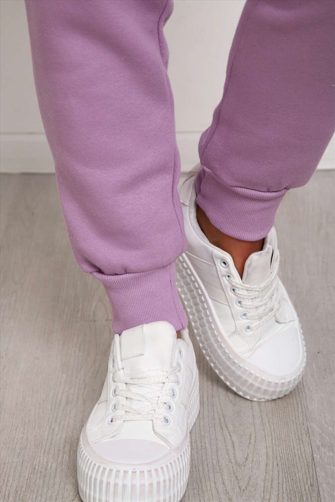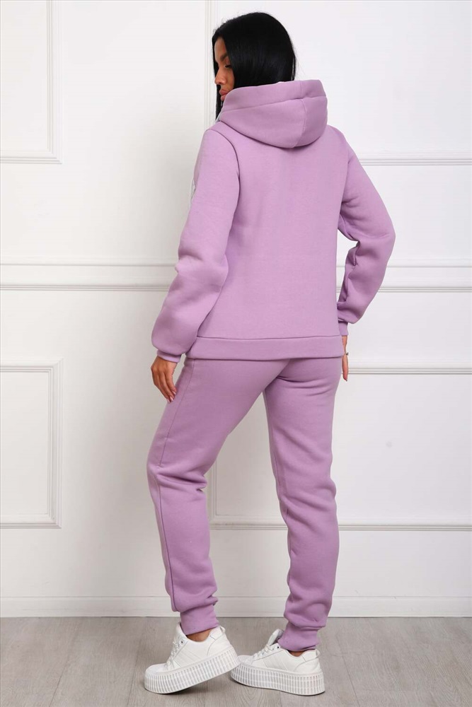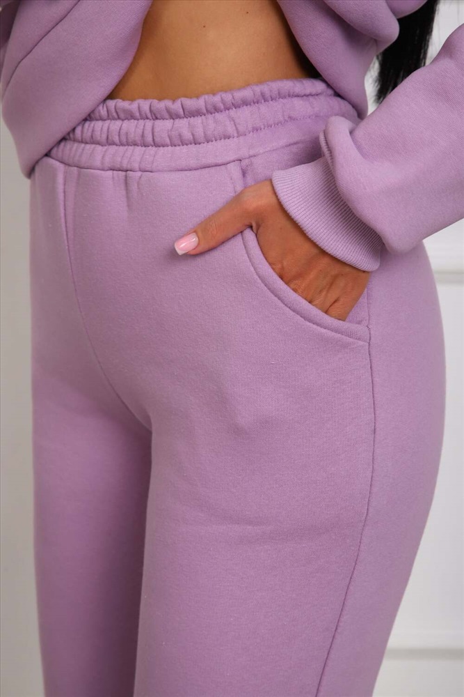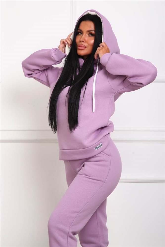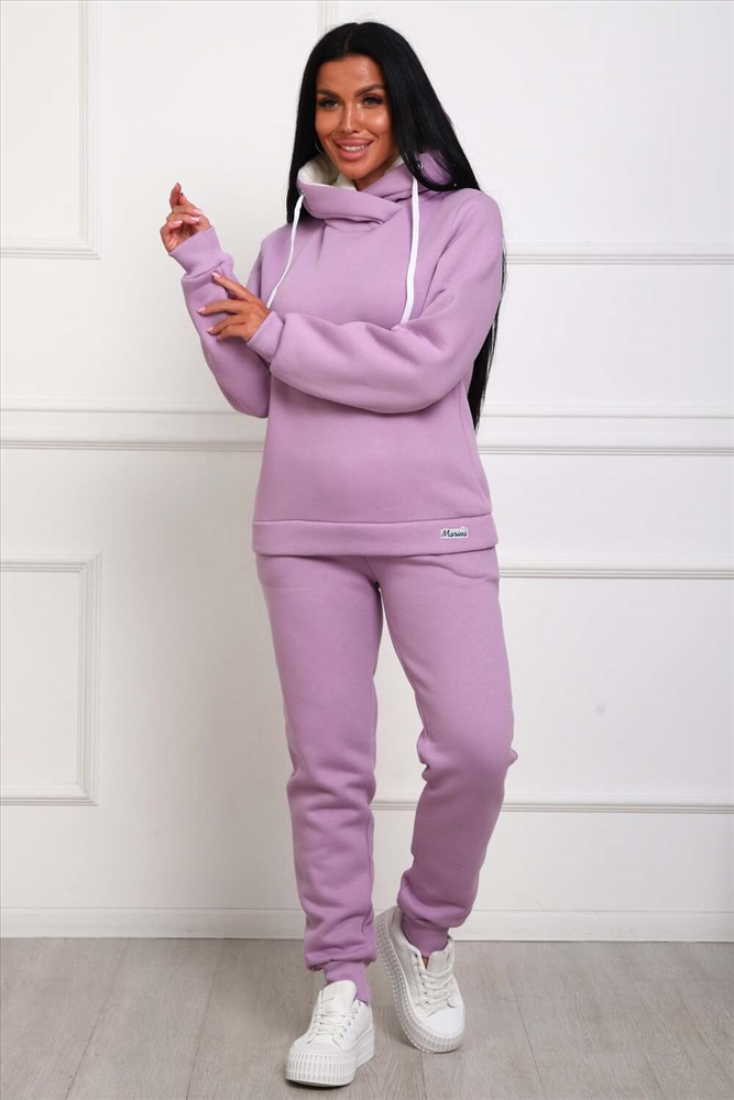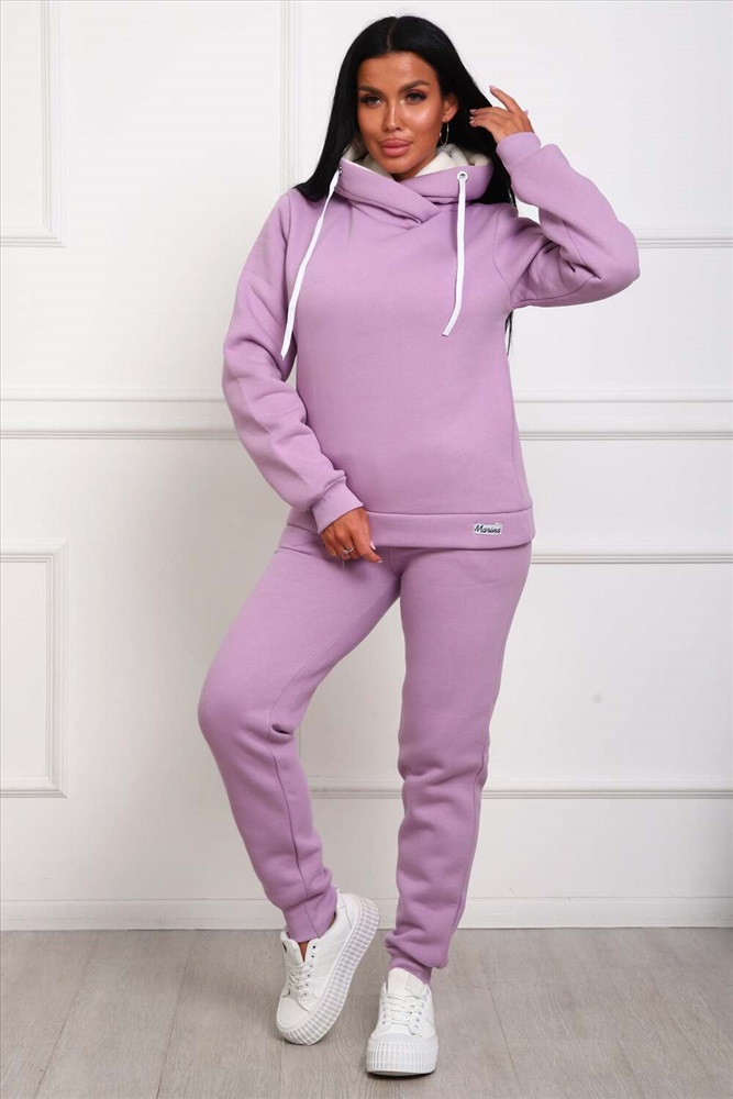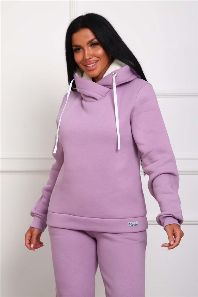 Застежка: без застежки Костюм женский из футера 3-х нитки с начесом. Состоит из толстовки с капюшоном и брюк. Толстовка прямого силуэта, низ на поясе. Рукав втачной на манжете. Капюшон - воротник хомут, с люверсами и шнуром. Подкапюшон из велсофта. Карманов нет. Брюки прямого кроя, на манжете по низу изделия. В боковых швах выполнены карманы. Пояс отрезной, на резинке 4см. шириной.