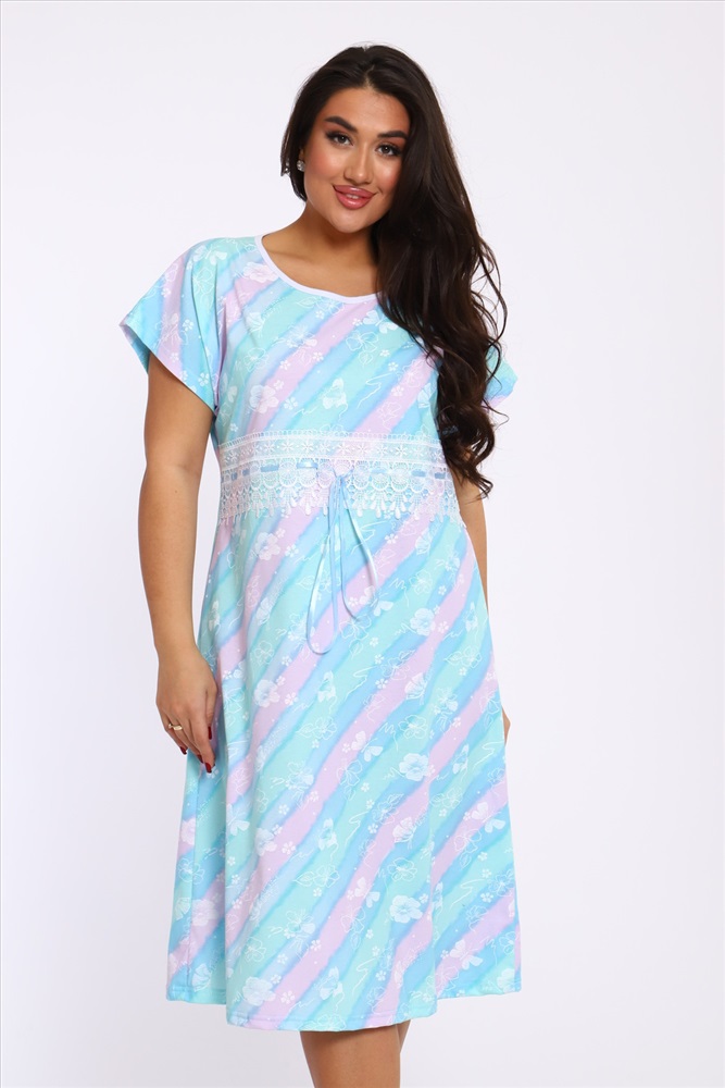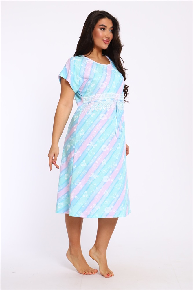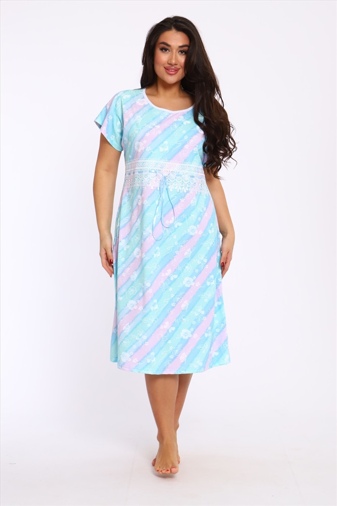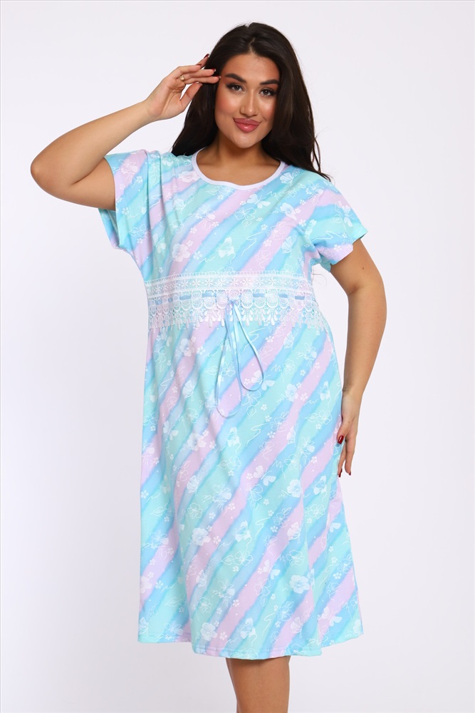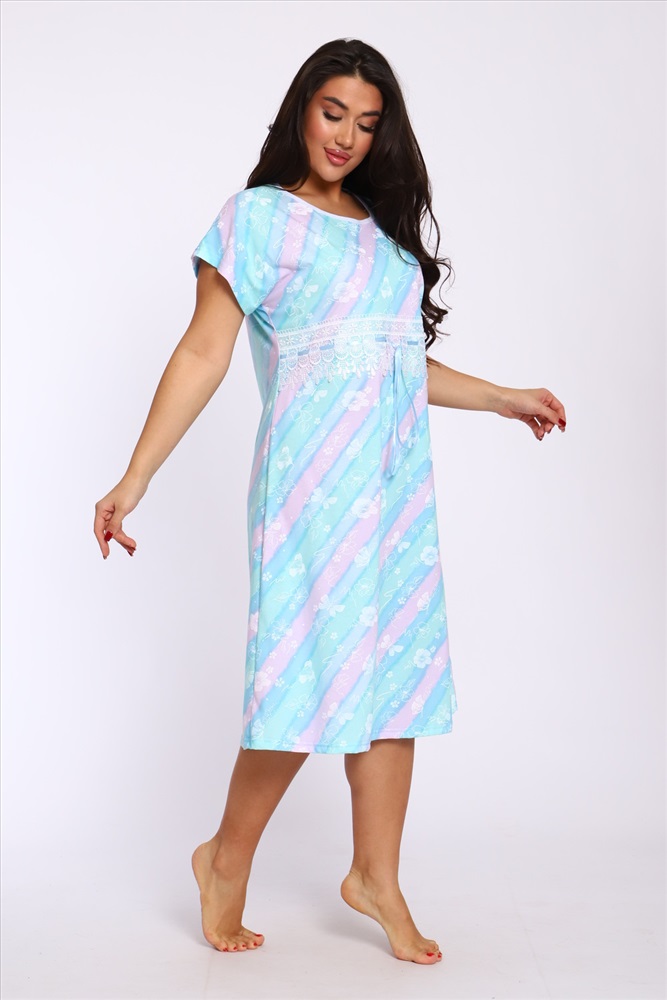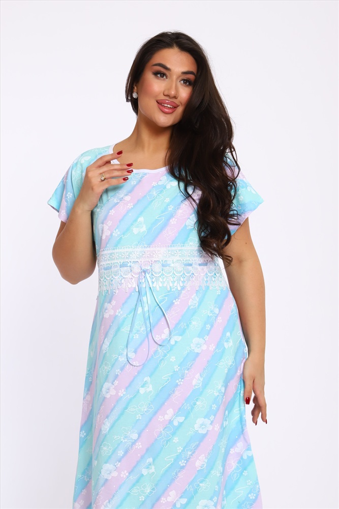 Стиль: домашний Ночная сорочка свободного кроя со спущенной проймой из 100% хлопка. Длина ниже колена. Изюминка этой уютной сорочки - красивое широкое кружево с лентой, которую можно слегка стянуть под линией груди. Благодаря натуральному составу она обладает прекрасной воздухопроницаемостью, позволяя вашей коже дышать во время сна. Носите с удовольствием!