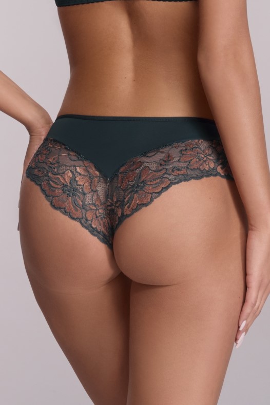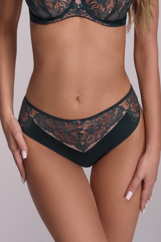 Трусики бразильяна со средней линией талии АVA 2175 выполнены в цвете Azure (лазурный) из эластичного трикотажного полотна и изумрудного кружева, украшенного золотым цветочным узором. Ластовица проложена 100% хлопком. Трусики идеально комплектуются с бюстгальтером арт. 2174, 2175.