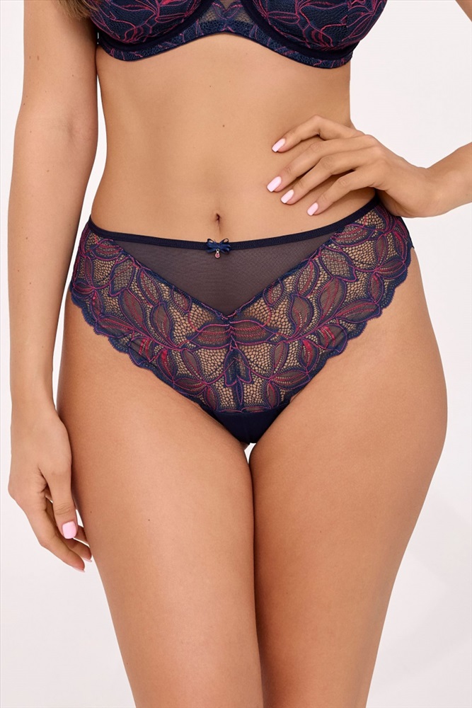 Трусики бразильяна со средней линией талии АVA 2183 выполнены в цвете navy blue (темно-синий) спереди из восхитительного темно-синего кружева с освежающим цветом фуксии и тюля в тон, спинка из эластичного трикотажного полотна с V-образной вставкой из кружева. Ластовица проложена 100% хлопком. Трусики идеально комплектуются с бюстгальтером арт. 2182, 2183.