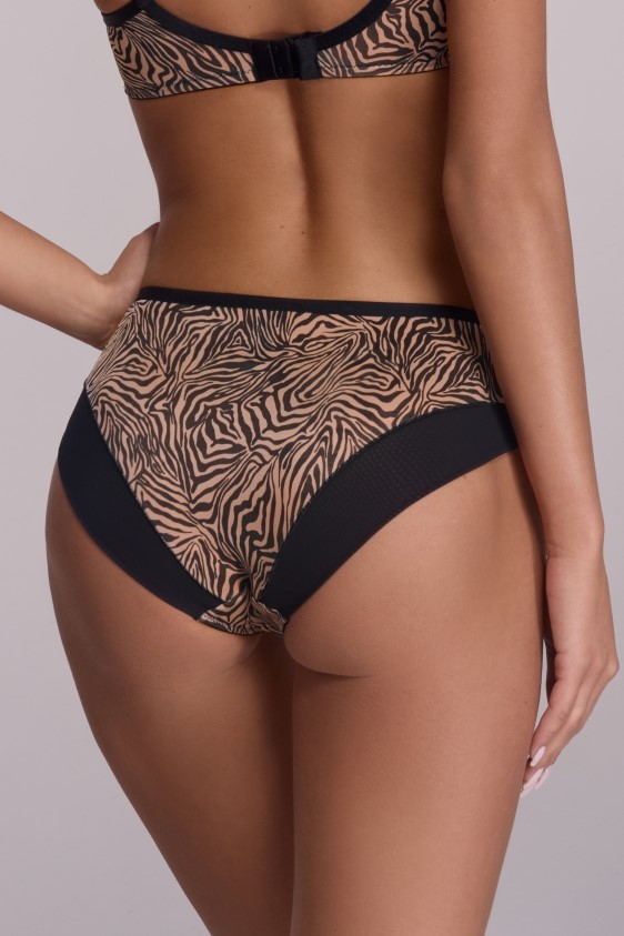 Трусики слип со средней линией талии АVA 2191 выполнены в цвете tiger (Тигр) из эластичного трикотажного полотна с тигровым принтом, спереди узкая вставка из черного тюля, с тонким золотым декором, на спинке проймы ног из сетки, сложенной вдвое. Ластовица проложена 100% хлопком. Трусики идеально комплектуются с бюстгальтером арт. 2191, 2192, 2193.