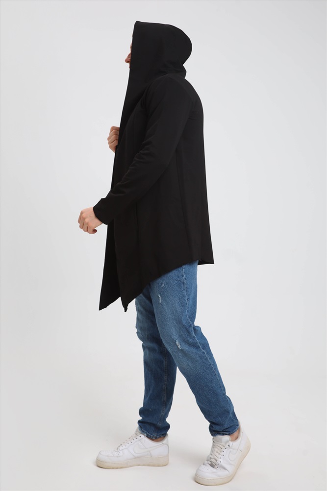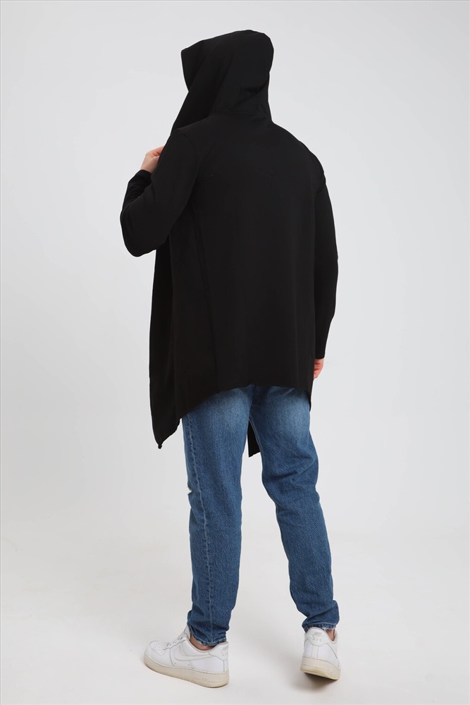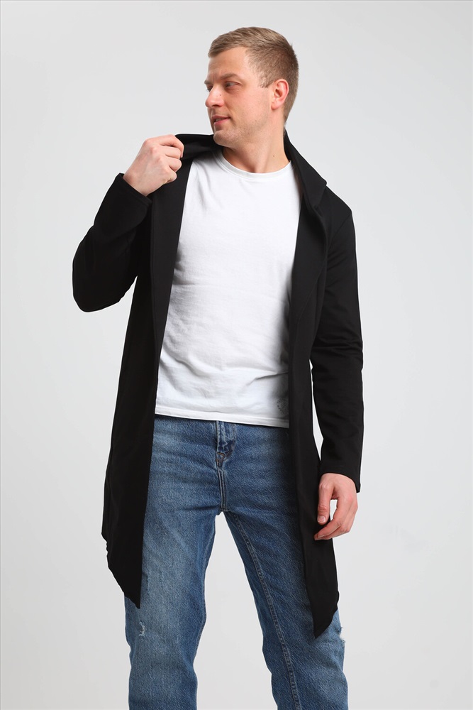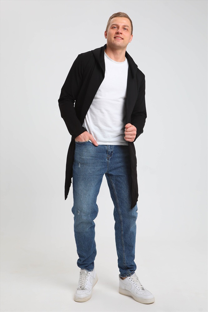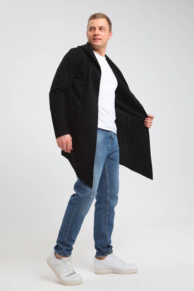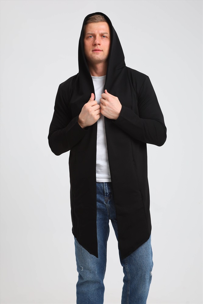Застежка: без застежки Модная современная мужская толстовка-мантия. Без застежки, с капюшоном, по бокам карманы. Асимметричный низ, передние полочки длиннее спинки