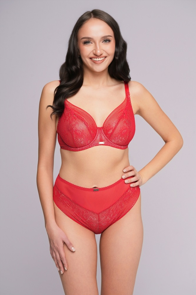 Трусики бразильяна со средней линией талии АVA 2252 выполнены из огненно-красного блестящего кружева, спереди V-образная вставка из сетки, на спинке V-образная вставка из красной сетки. Ластовица проложена 100% хлопком. Трусики идеально комплектуются с бюстгальтером арт. 2127, 2128, 2252.
