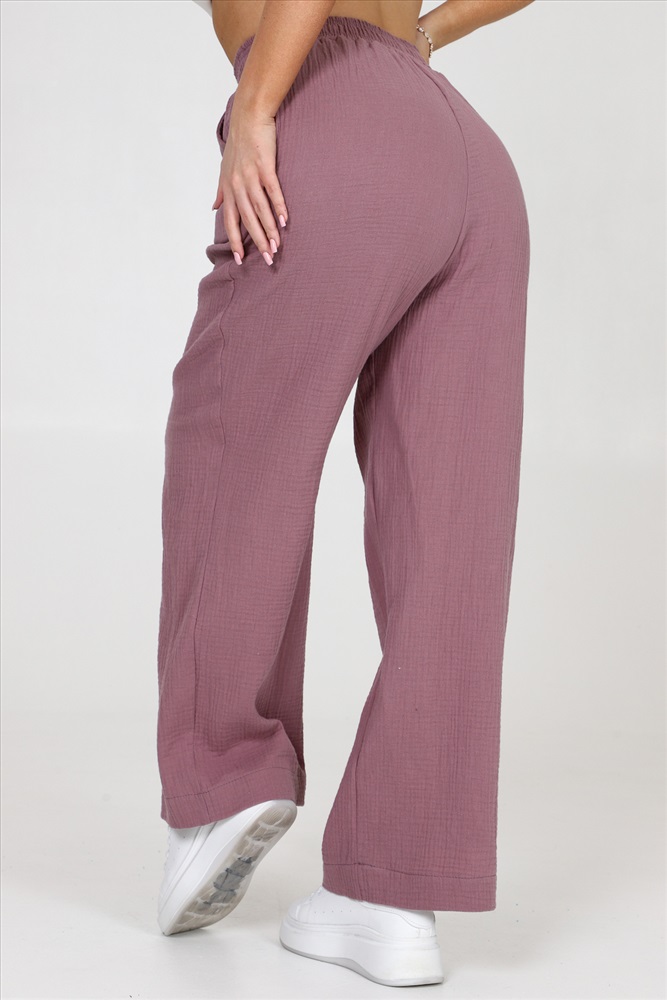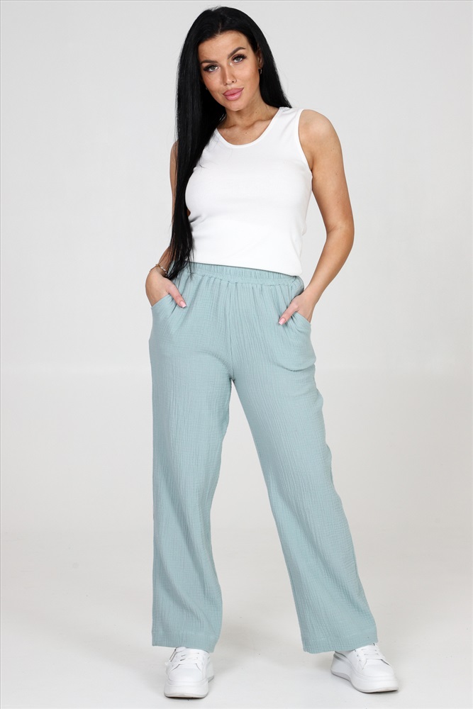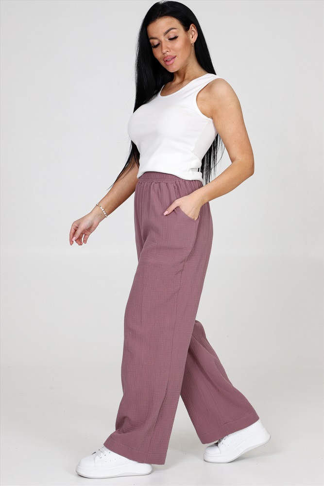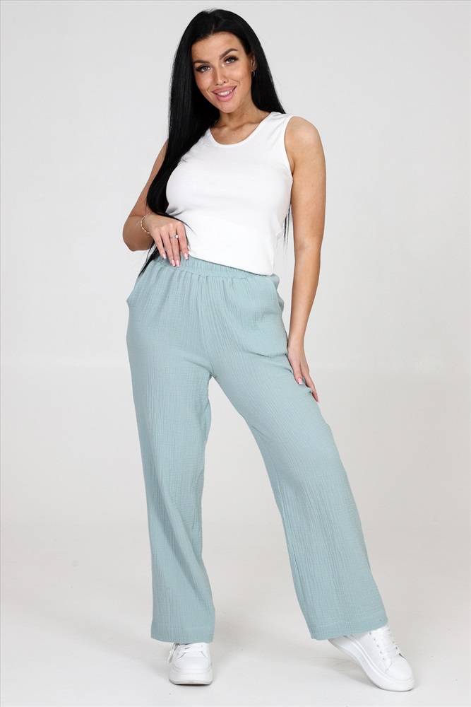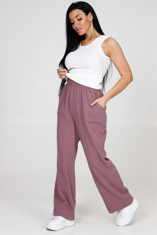 Застежка: без застежки Брюки женские из муслина свободного покроя, на притачном поясе и с боковыми карманами.