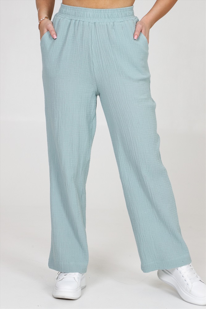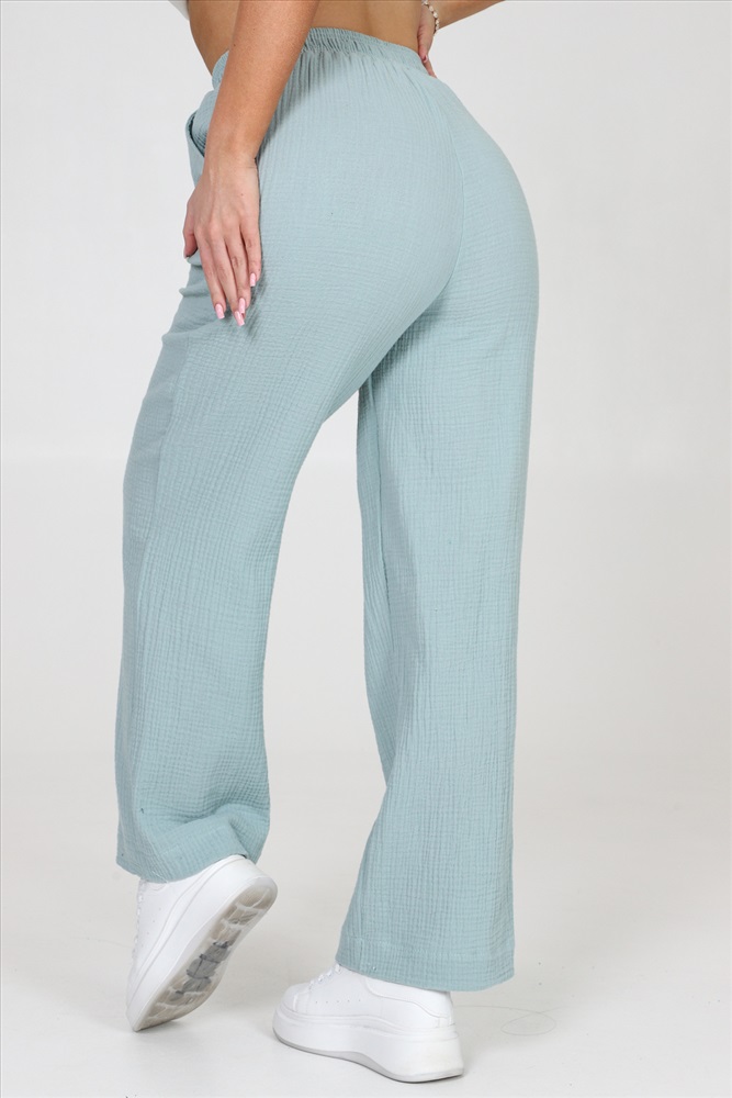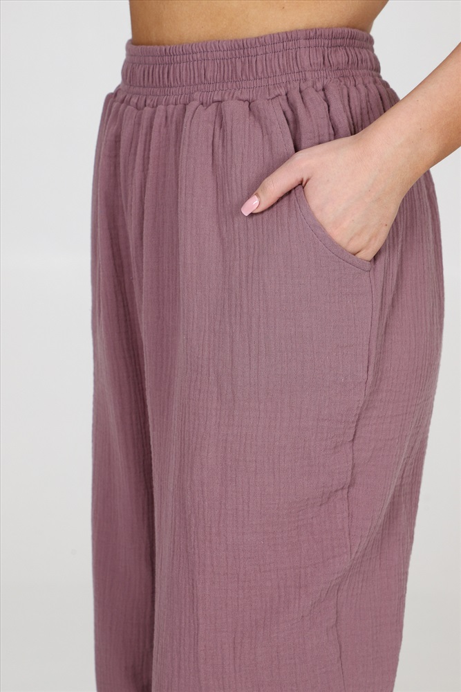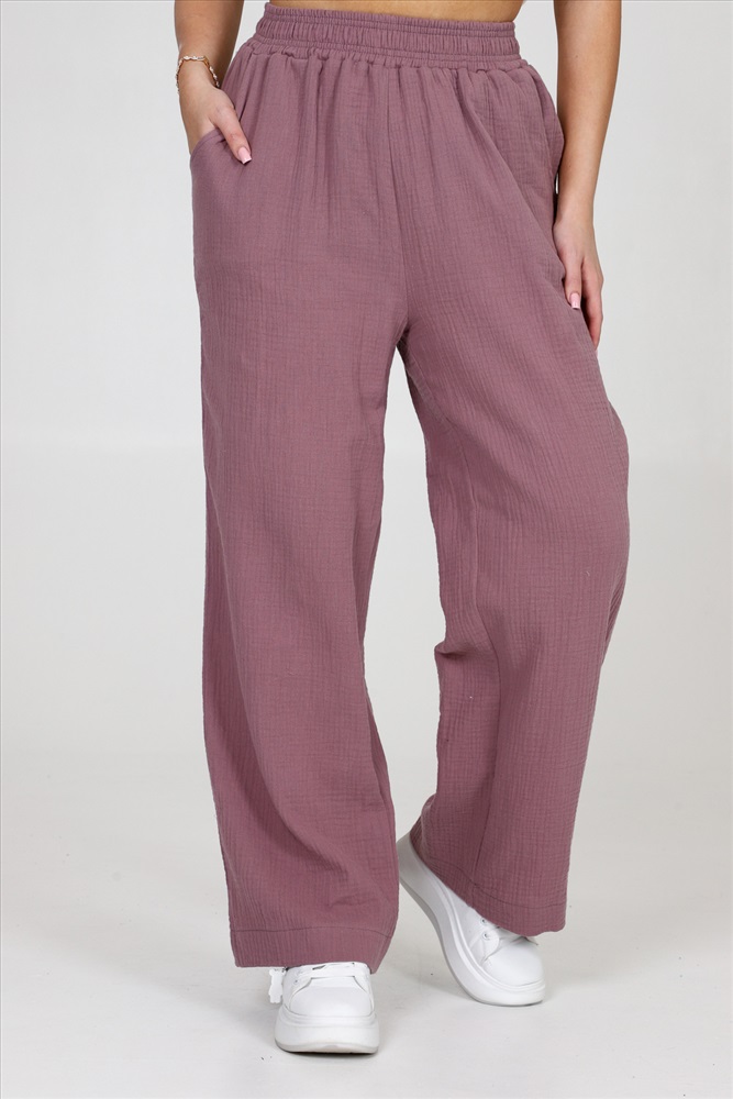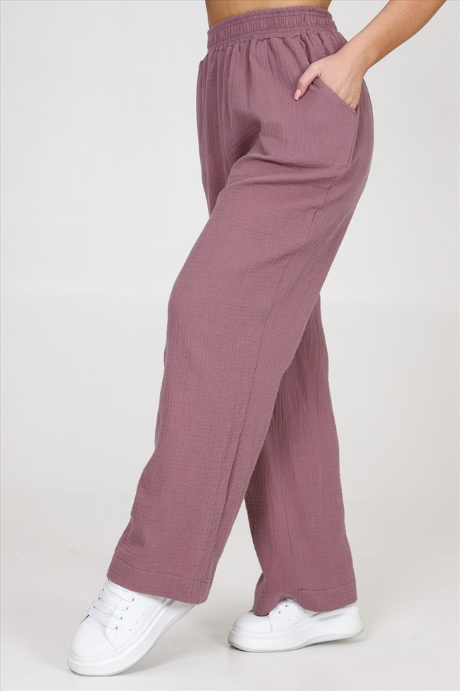 Застежка: без застежки Брюки женские из муслина свободного покроя, на притачном поясе и с боковыми карманами.