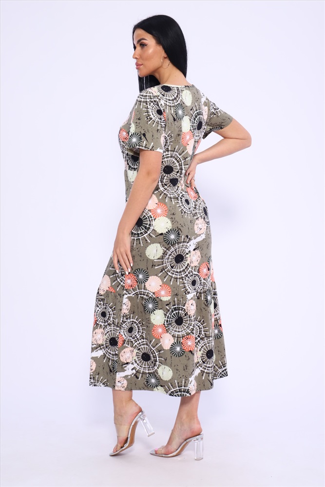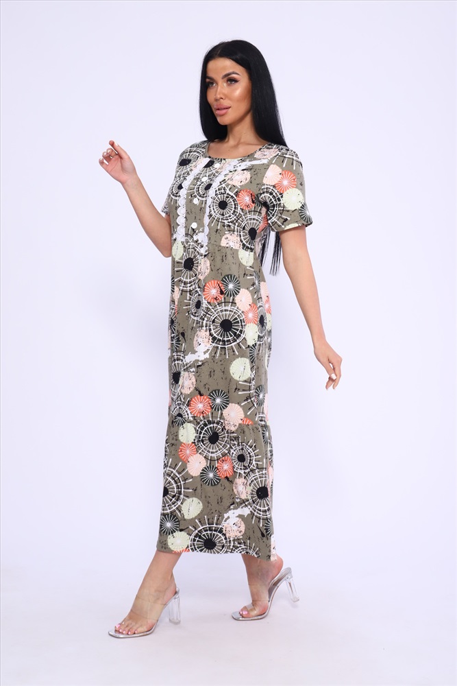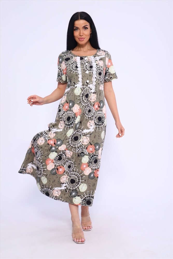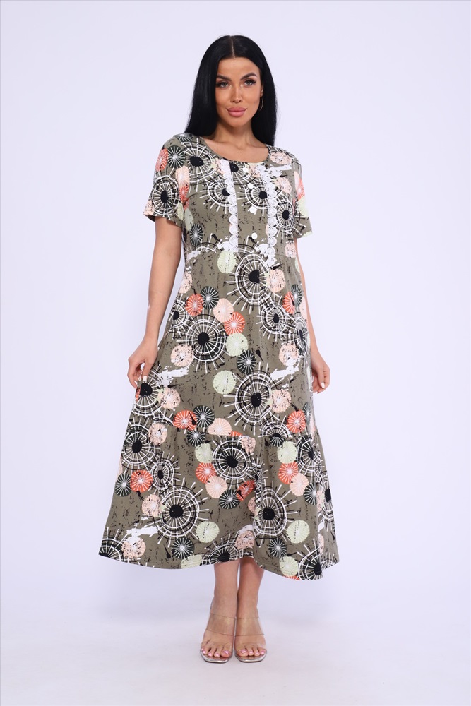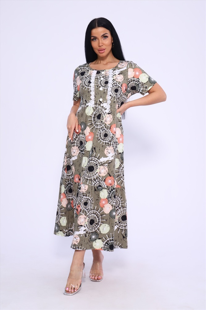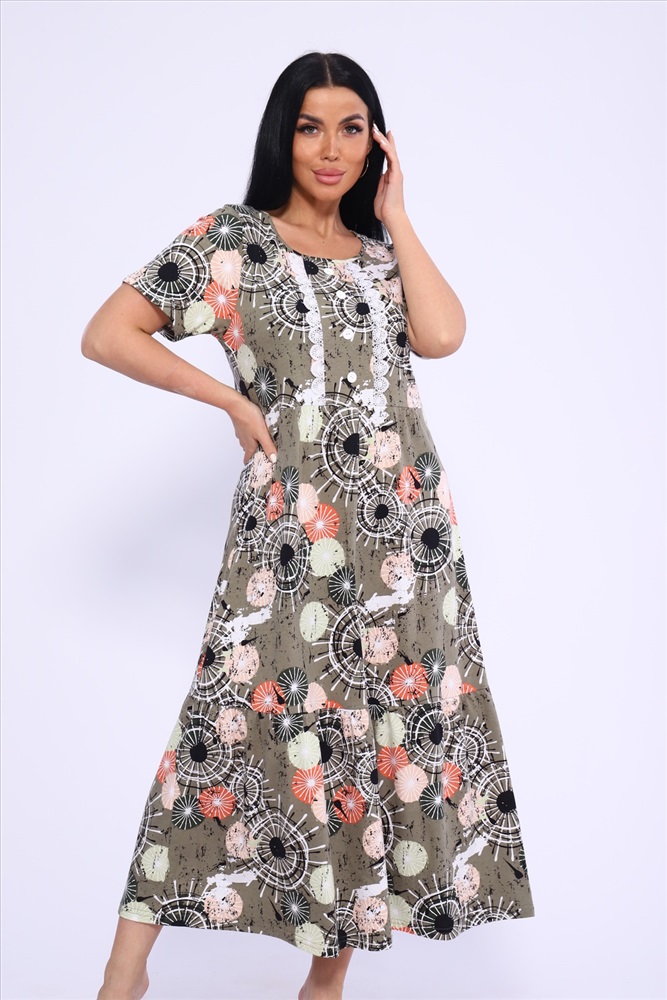 Застежка: без застежки Платье женское из кулирки. Платье свободного покроя. На кокетке полочки настрочено кружево. Рукав втачной, короткий. Верхний и нижний ярус присборен.
