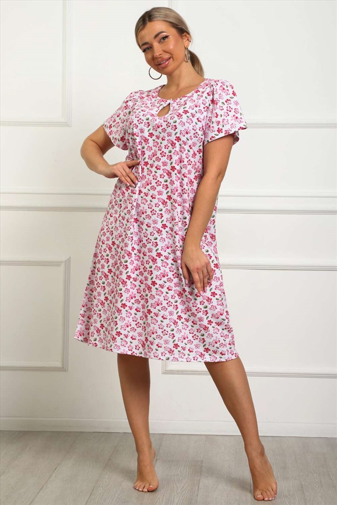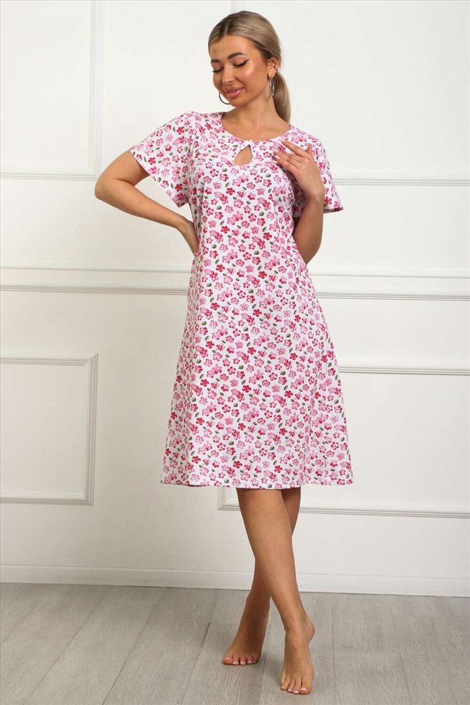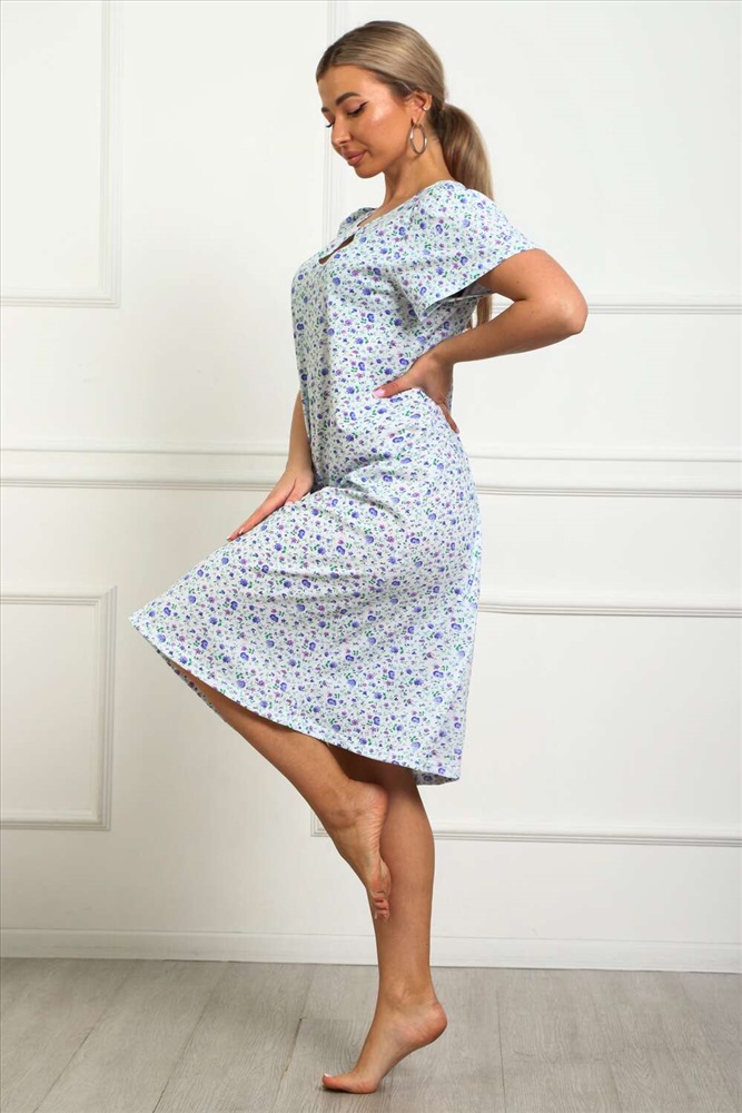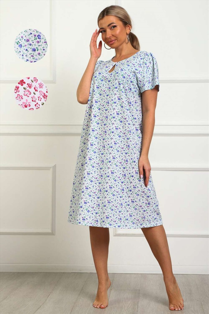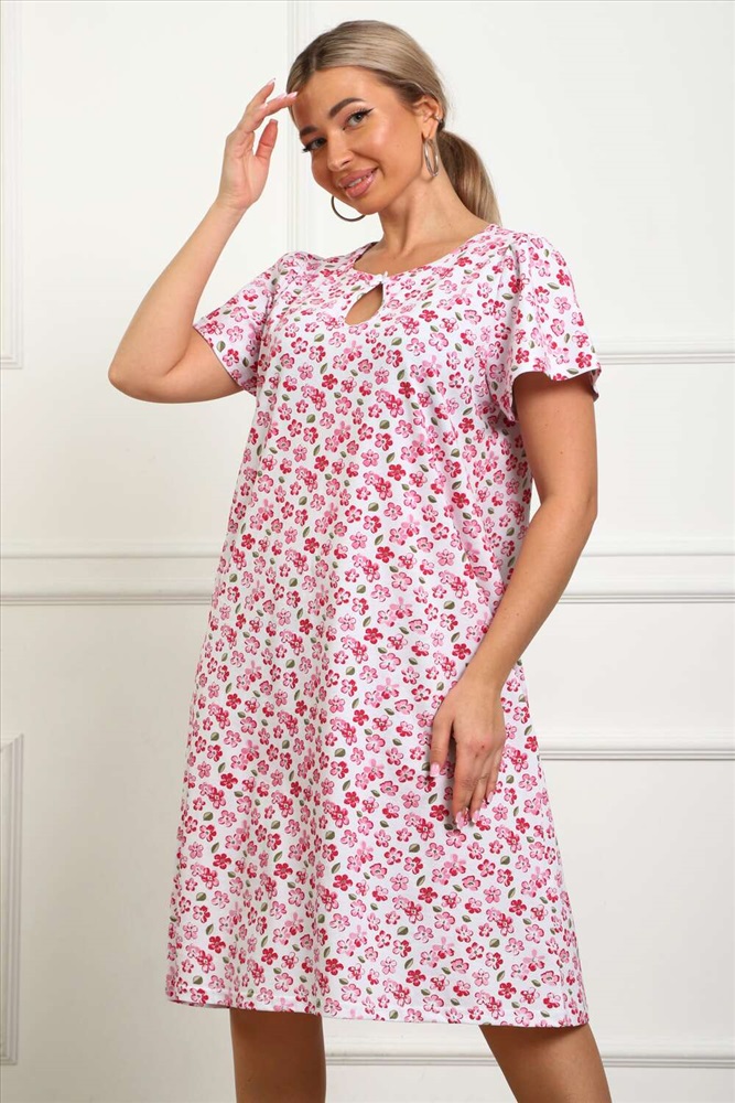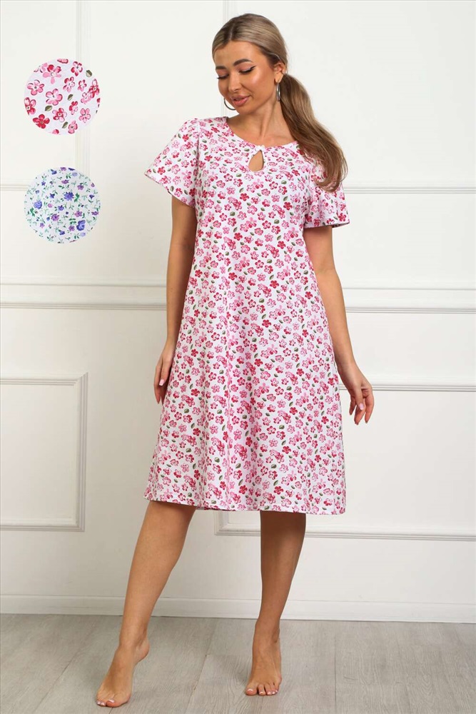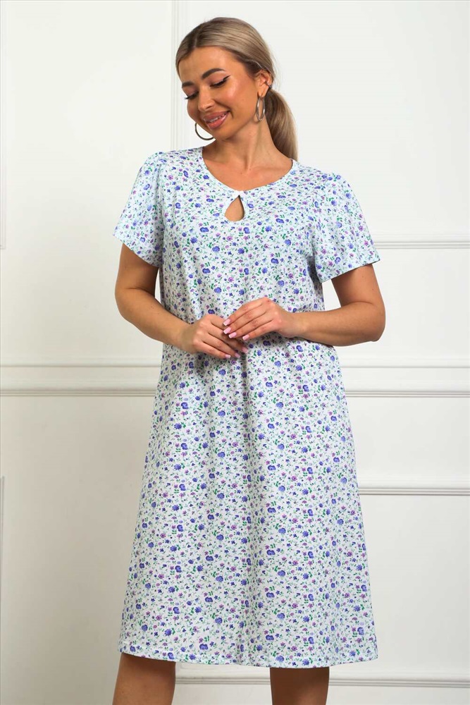 Состав: хлопок 100% Модель: 29531 Сорочка женская Тип товара: сорочка Материал: кулирка | кулирка Бренд: Натали Суслова Длина: средняя длина Карман: без карманов Назначение: для дома НДС: Без НДС Рисунок: цветы Рукав: короткий рукав Сезонность: лето | осень | весна | зима Силуэт: прямой | расклешенный | свободный Стиль: домашний Воротник: без воротника Застежка: без застежки Сорочка женская из натурального набивного трикотажа, хлопок 100%. Силуэт свободный, расширенный к низу. Горловина круглой формы с капелькой по центру. Обработана окантовкой. Отделкой служит бантик. Рукав короткий, свободный. В верхней части оката выполнена небольшая сборка. Низ изделия прямой. Длина ниже колена. Таблица размеров и веса