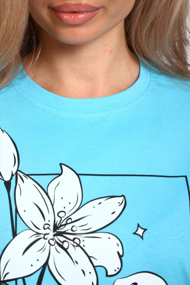 Застежка: без застежки Туника женская прямого силуэта. Низ изделия прямой. Длинна выше колена, плечо спущенное, рукав короткий. Горловина круглой формы, обработана планкой с отделочной строчкой по шву притачивания. Принт (шелкография) располагается по центру переда.
