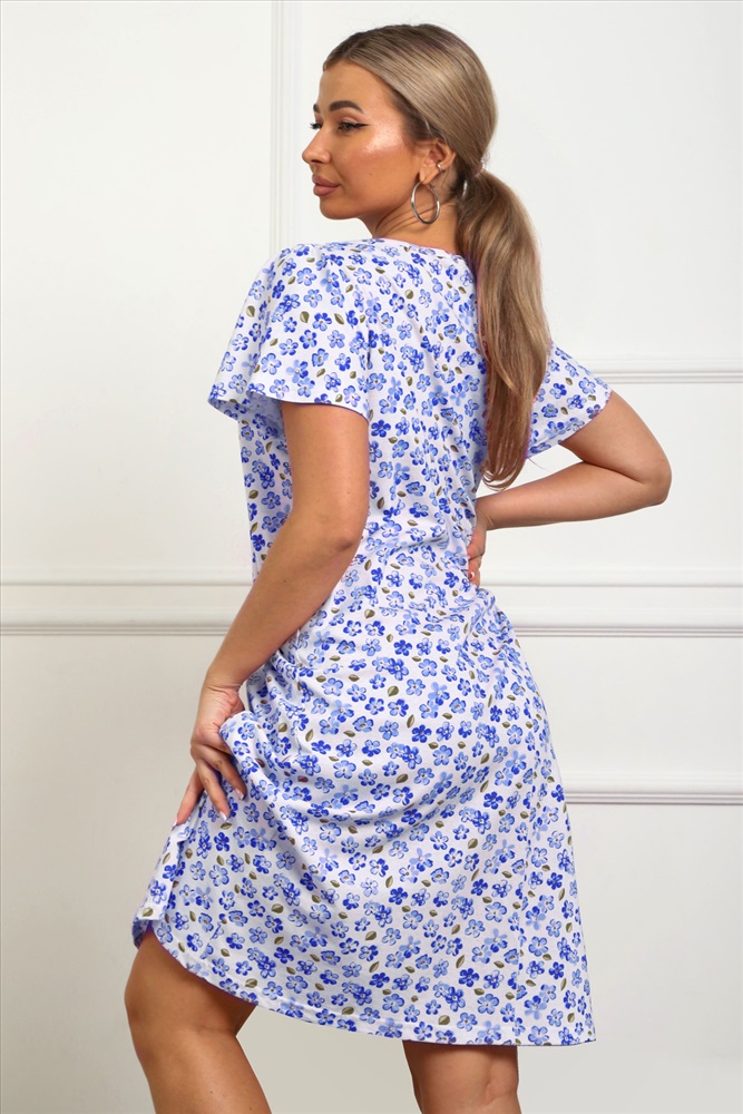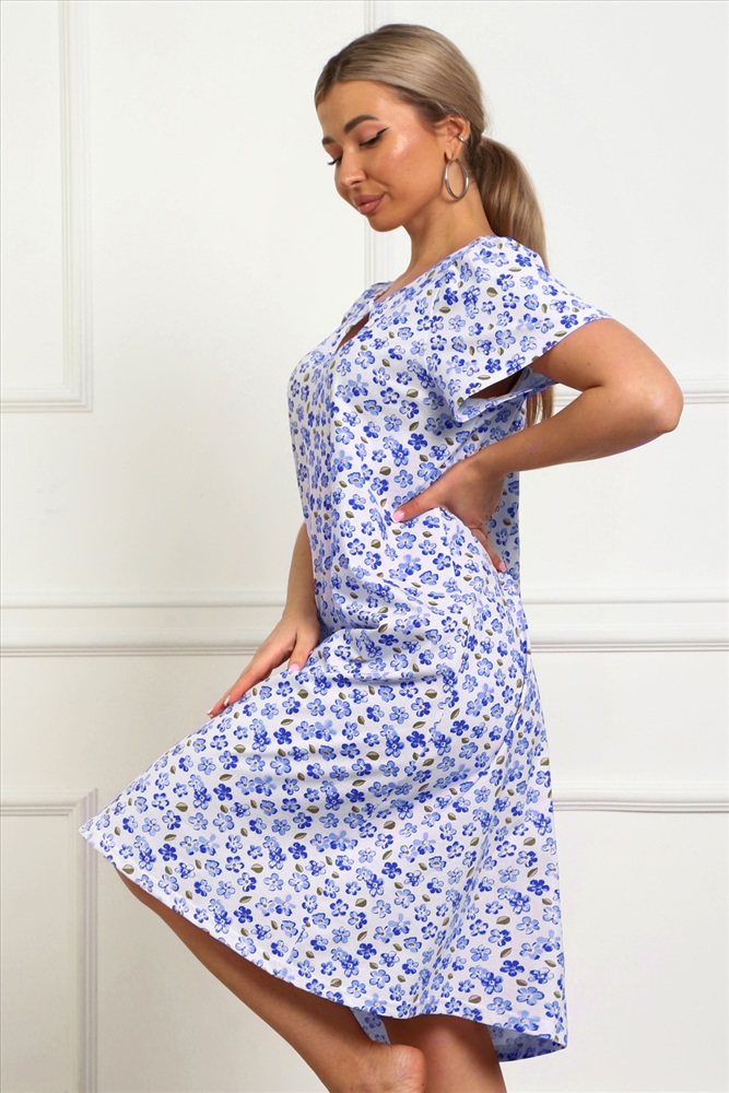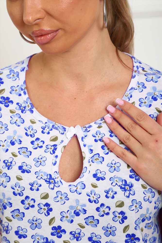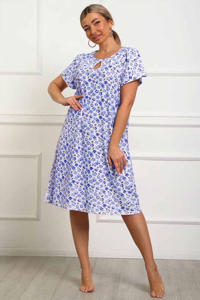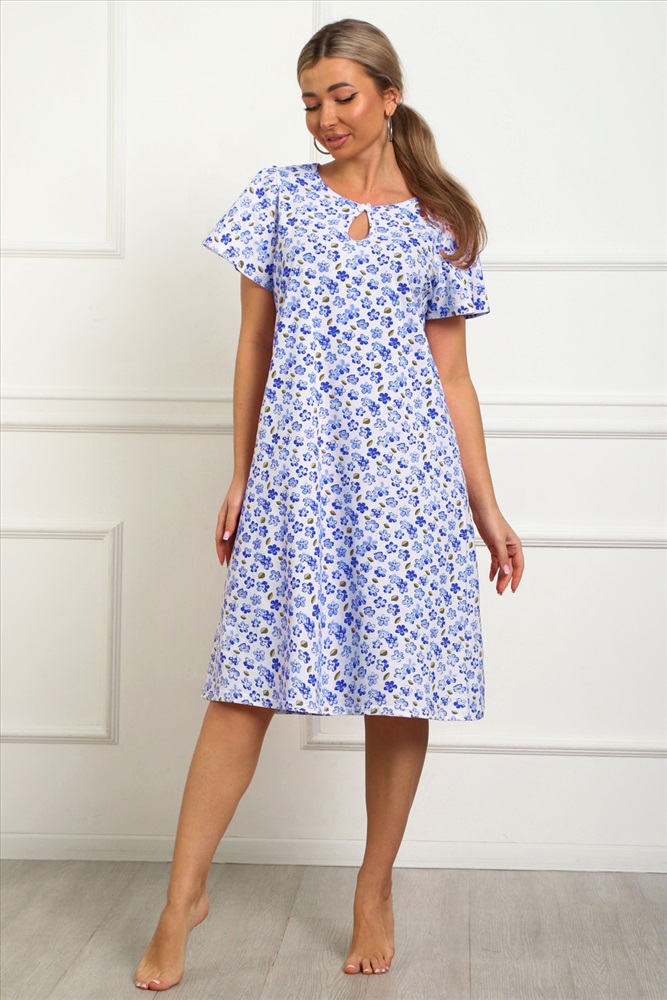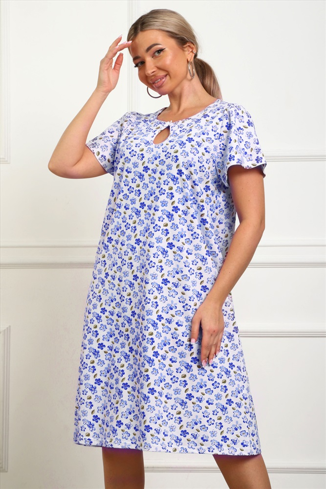 Стиль: домашний Сорочка женская из натурального набивного трикотажа, хлопок 100%. Силуэт свободный, расширенный к низу. Горловина круглой формы с капелькой по центру. Обработана окантовкой. Отделкой служит бантик. Рукав короткий, свободный. В верхней части оката выполнена небольшая сборка. Низ изделия прямой. Длина ниже колена.