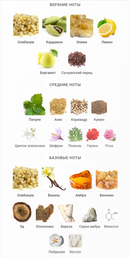 Верхние ноты: Олибанум, Кардамон, Элеми, Лимон, Бергамот и Сычуанский перец; средние ноты: Пачули, Анис, Кориандр, Кумин, Цветок апельсина, Шафран, Полынь, Герань и Роза; базовые ноты: Олибанум, Ваниль, Амбра, Бензоин, Уд, Опопонакс, Береза, Серая амбра, Мальтол, Лабданум и Мускус.