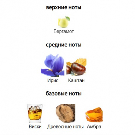 Верхняя нота: Бергамот; средние ноты: Ирис и Каштан; базовые ноты: Виски, Древесные ноты и Амбра.