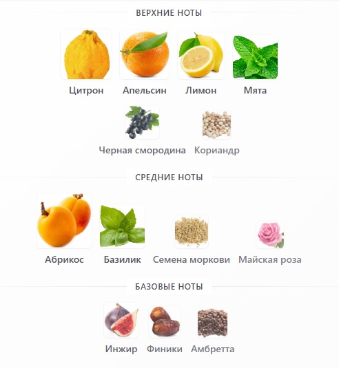 Верхние ноты: Цитрон, Апельсин, Лимон, Мята, Черная смородина и Кориандр; средние ноты: Абрикос, Базилик, Семена моркови и Майская роза; базовые ноты: Инжир, Финики и Амбретта.