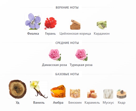 Верхние ноты: Фиалка, Герань, Цейлонская корица и Кардамон; средние ноты: Дамасская роза и Турецкая роза; базовые ноты: Уд, Ваниль, Амбра, Бензоин, Карамель, Мускус и Кедр
