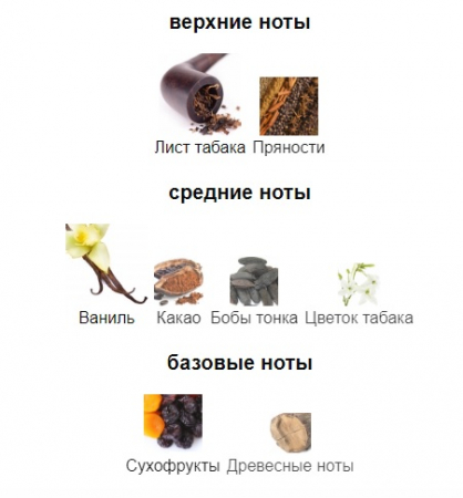 Верхние ноты: Лист табака и Пряности; средние ноты: Ваниль, Какао, Бобы тонка и Цветок табака; базовые ноты: Сухофрукты и Древесные ноты