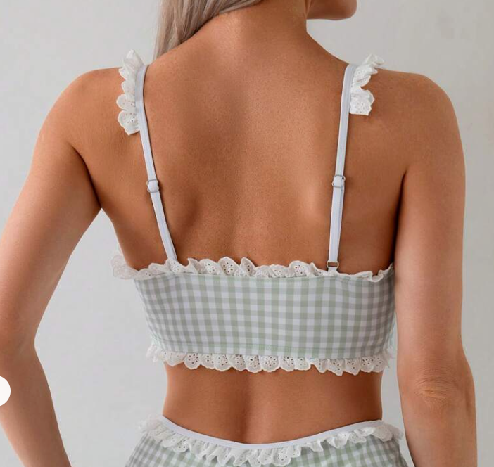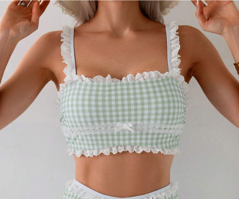 2pcs/Set Women's Green Plaid Random Floral Print Bowknot Collar Ruffle Hem Top And Shorts Set, Cute Minimalist Vest Bikini Outfit For Daily Wear For Summer Beach Vacation