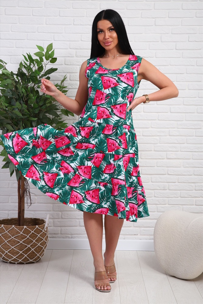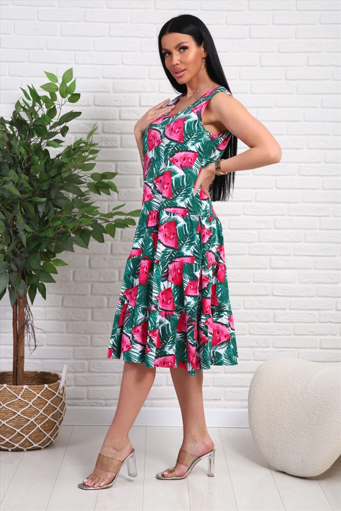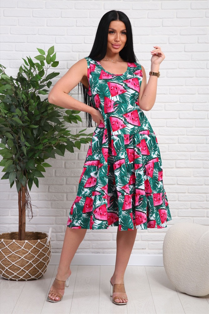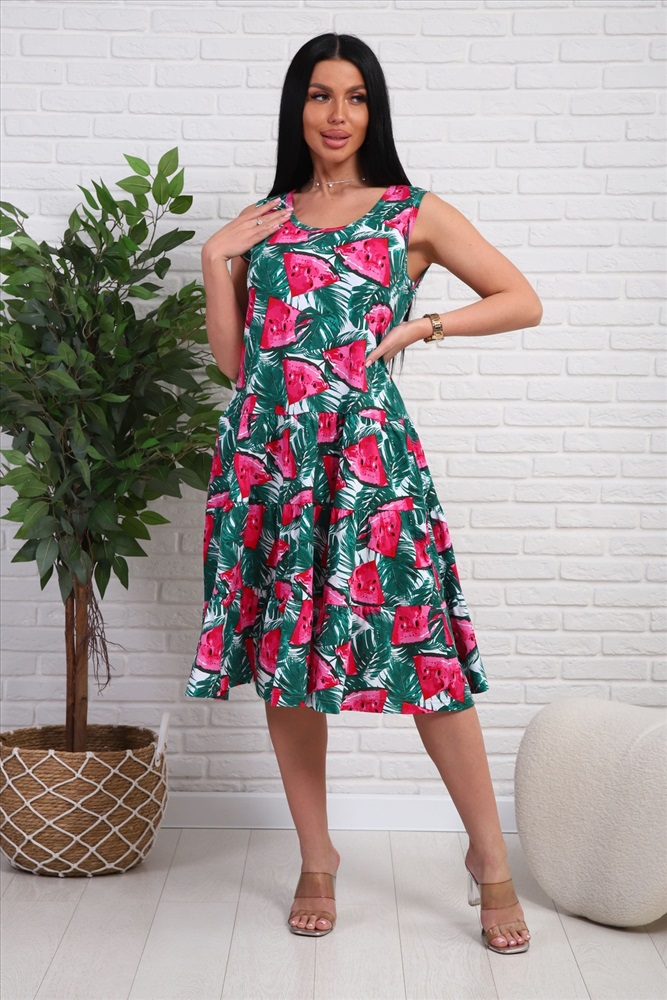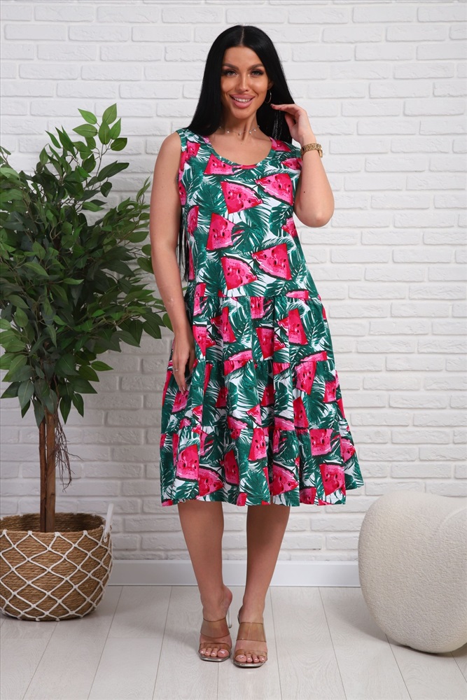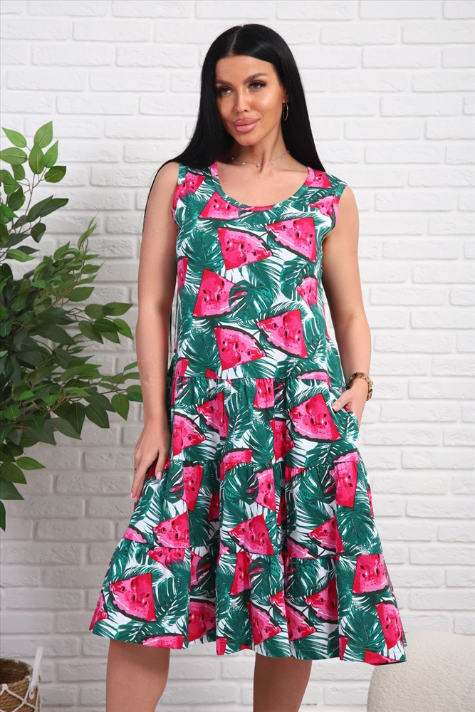 Застежка: без застежки Платье-сарафан из натурального набивного трикотажа. Лиф приталенного силуэта. Юбка трёхъярусная , пышная. Горловина круглой формы. Рукавов нет. в боковых швах карманы.