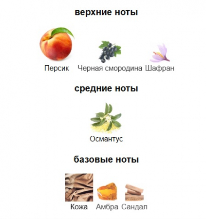 Верхние ноты: Персик, Черная смородина и Шафран; средняя нота: Османтус; базовые ноты: Кожа, Амбра и Сандал. Комментарии к товару