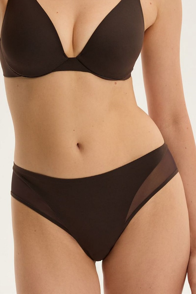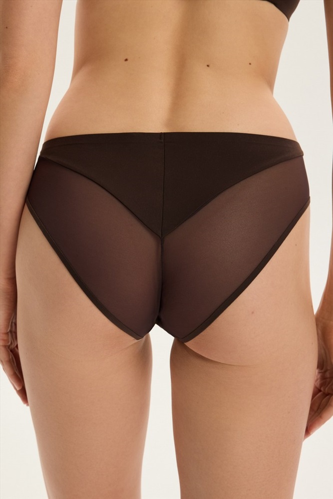 Слипы Cleary в глубоком шоколадно-коричневом цвете сочетают современный минимализм с нежной чувственностью. Деликатный эластичный материал мягко прилегает к телу, создавая линию, которая ненавязчиво подчеркивает женскую фигуру. Вставки из прозрачной сетки придают изделию лёгкость и современный вид, создавая эффект гармоничного контраста. Эта модель для женщин, которые ценят повседневный комфорт, но не отказываются от элегантности в мельчайших деталях. Хлопковая ластовица. Сеточка: 84% полиамид, 16% эластан.
