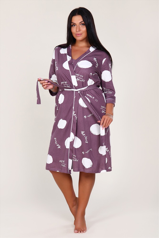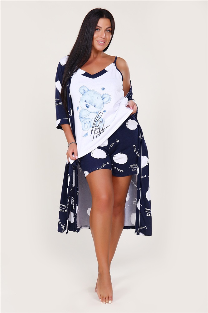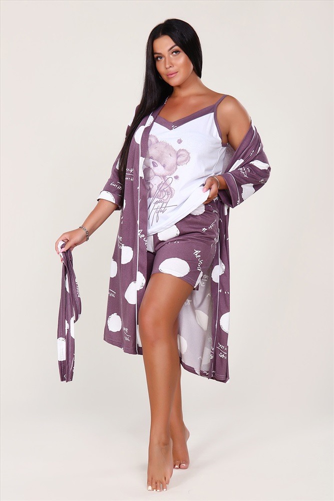 Застежка: на запах Комплект домашней одежды, состоящий из халата, топа и шорт, выполнен из 100% хлопка с принтом Миша и отличается комфортом, натуральным составом и милым дизайном Описание комплекта Материал: Комплект изготовлен из 100% хлопка (как правило, используется ткань кулирка, которая является мягкой, дышащей и приятной к телу). Состав: В набор входят три предмета: легкий халат, топ и шорты. Дизайн: Главная особенность принт Миша, который обычно представляет собой изображение милого медвежонка или абстрактный рисунок, ассоциирующийся с этим именем, что придает комплекту игривый и уютный вид. Халат: Легкий, на запах, с поясом, что позволяет регулировать посадку по фигуре. Рукав укороченный (до локтя). Топ: Как правило, на тонких или стандартных бретелях. Шорты: Удобного кроя, не стесняют движений, идеально подходят для сна или активного отдыха дома.