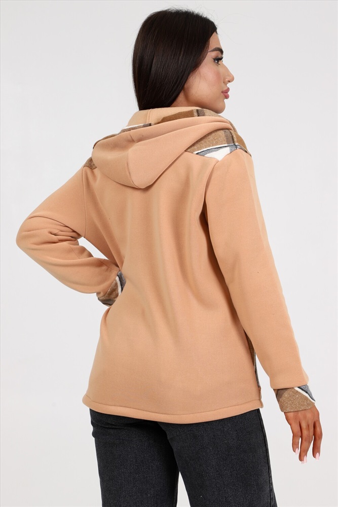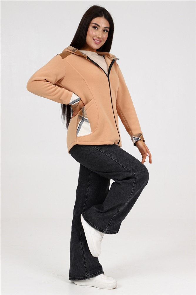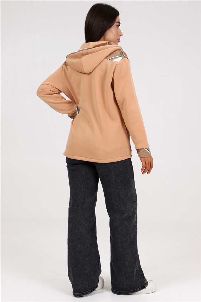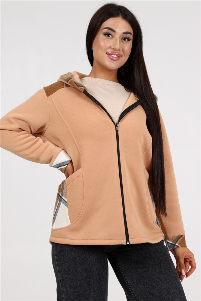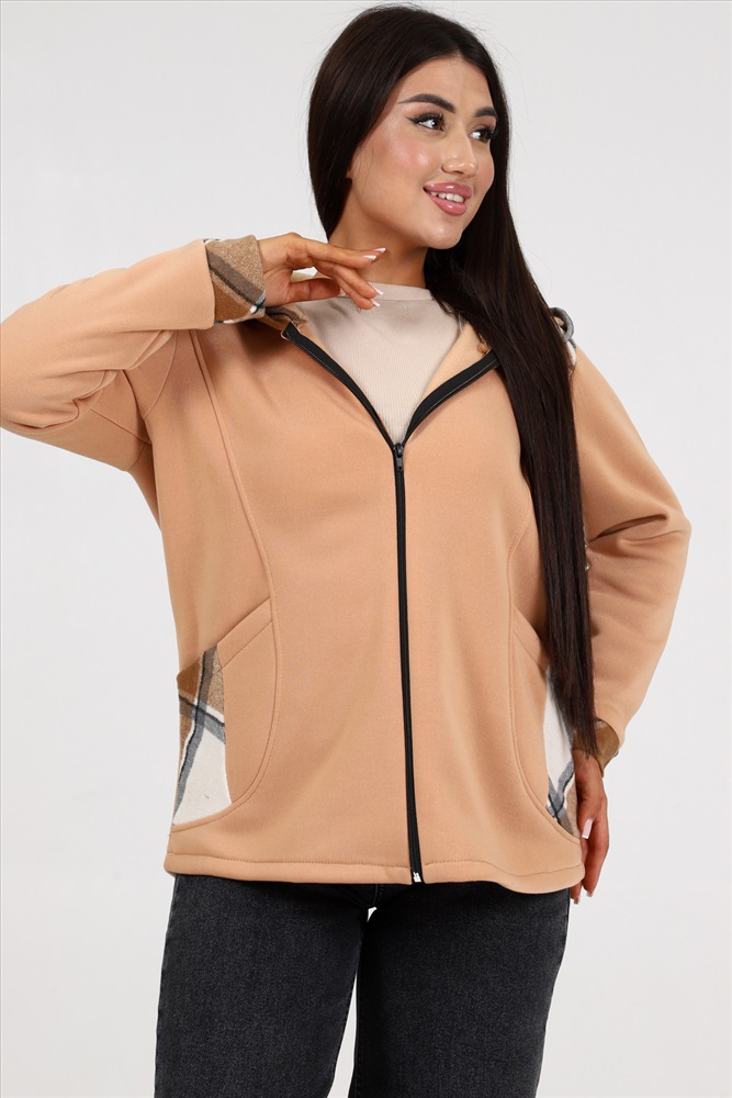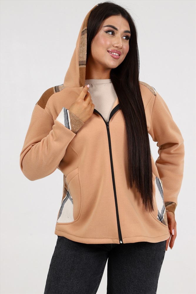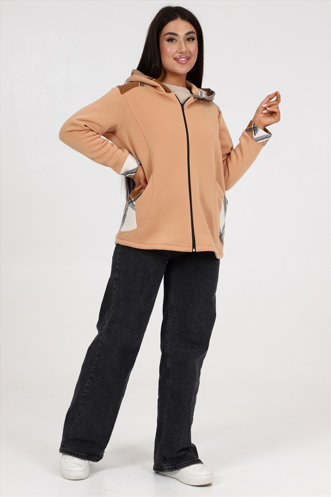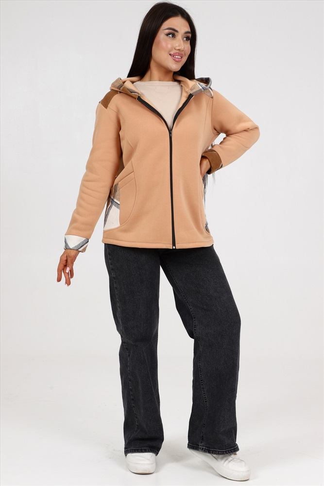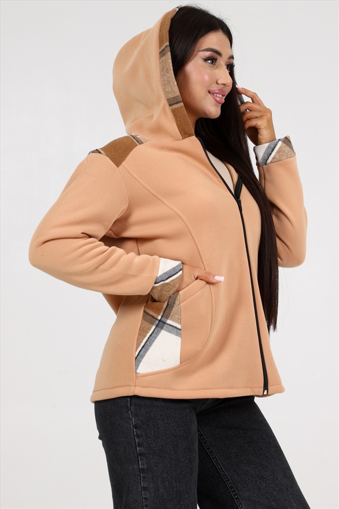 Застежка: молния Женская толстовка на молнии с капюшоном. Изделие прямое, длинный рукав на манжете, передняя полочка декорирована рельефными швами, имеются карманы. Хорошо подойдет для прохладных весенних вечеров.