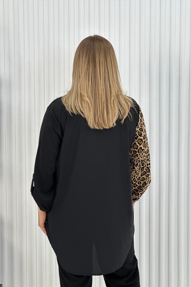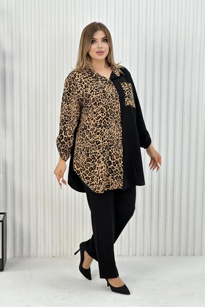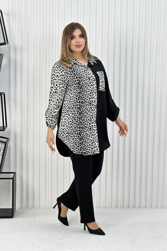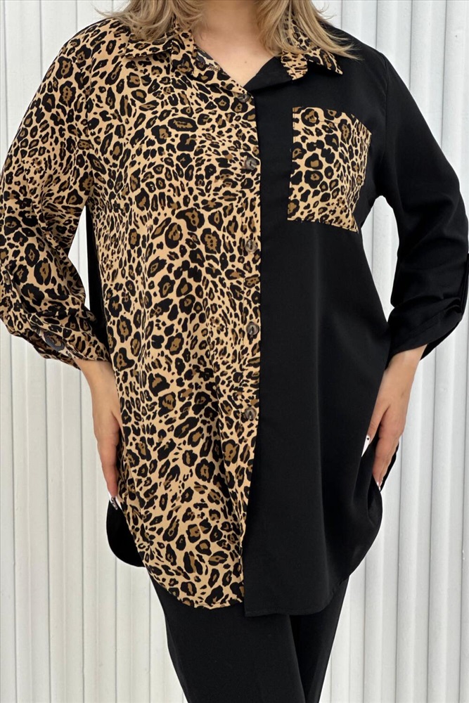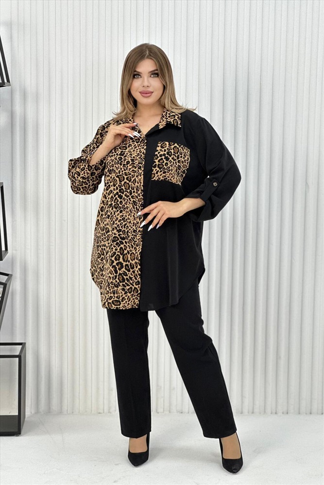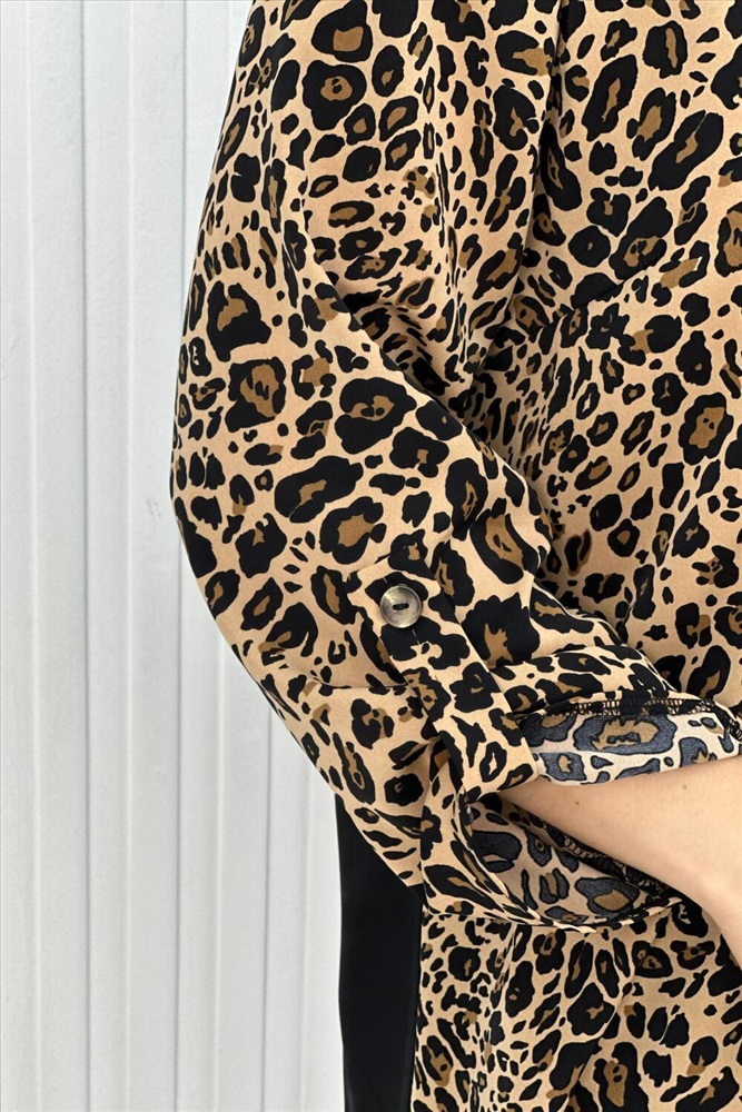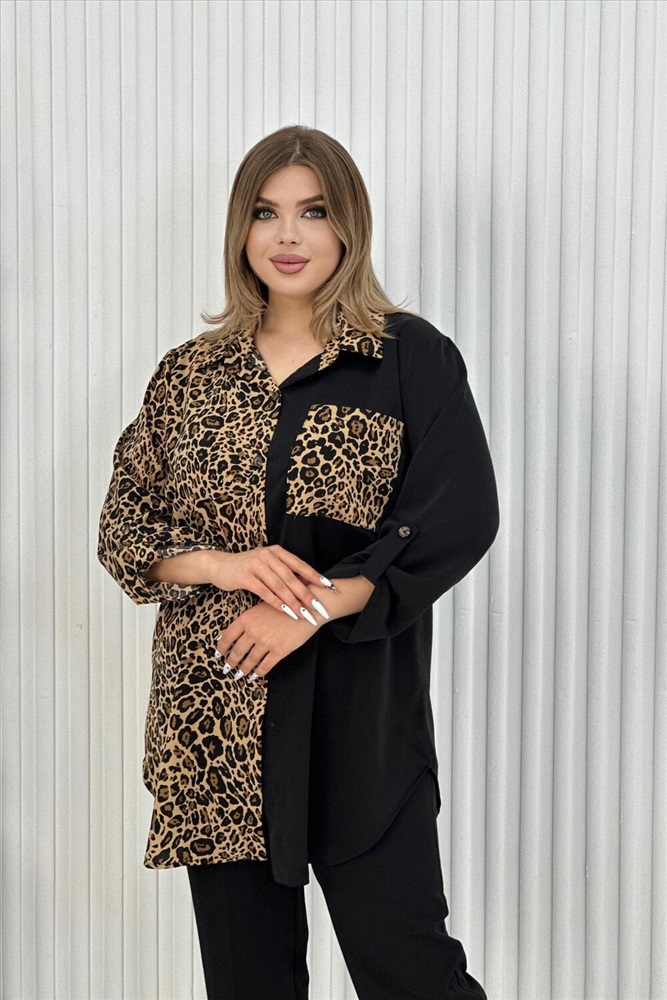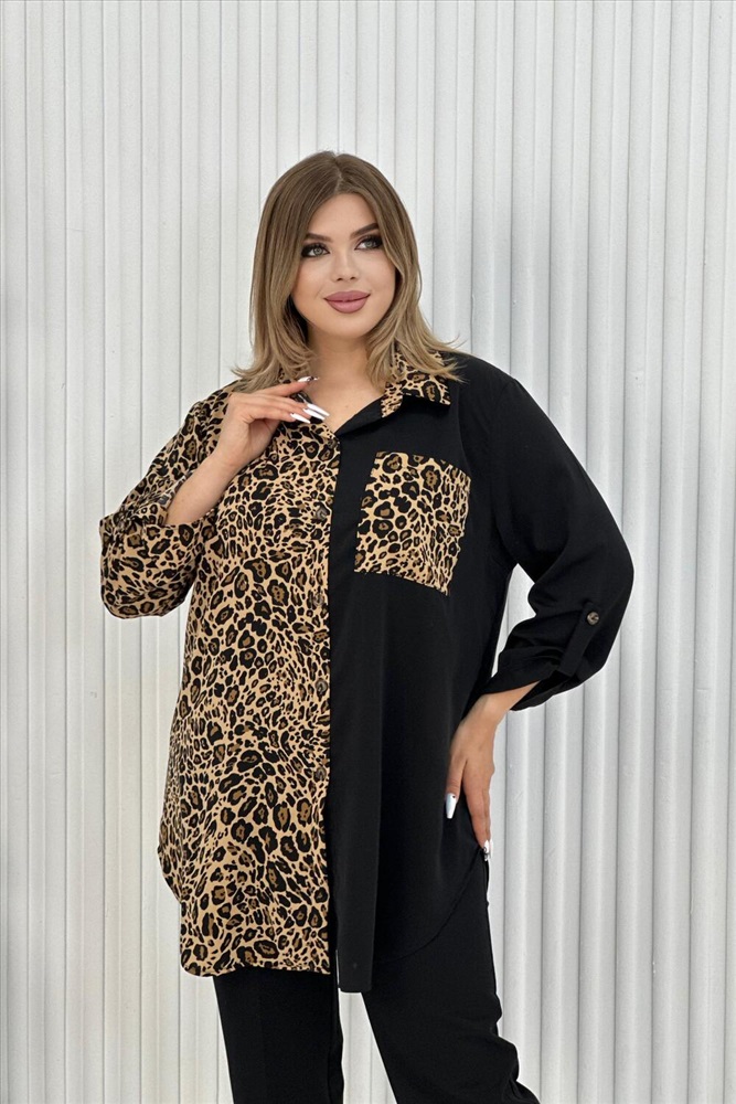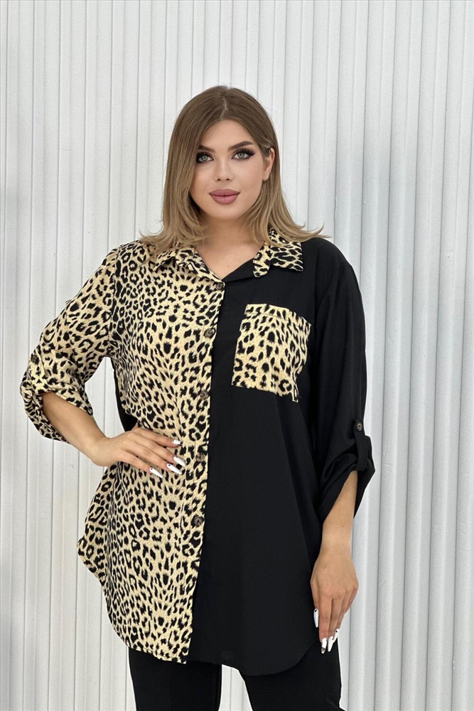 Застежка: пуговицы Элегантная женская туника с трендовым узором леопард. Блузка выполнена из легкой, но плотной ткани, воротник рубашечного типа, на передней полочке карман, на пуговицах, рукава с манжетом, также на пуговицах. Данная модель идеально подойдет для любых мероприятий, выхода на работу и просто на прогулку.
