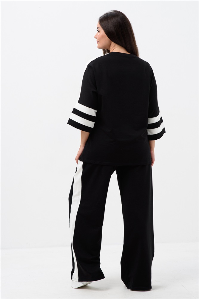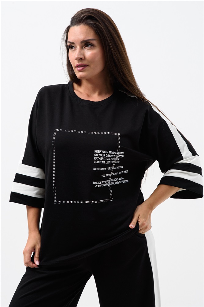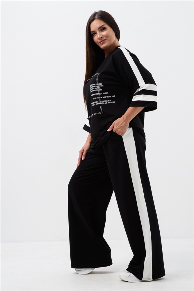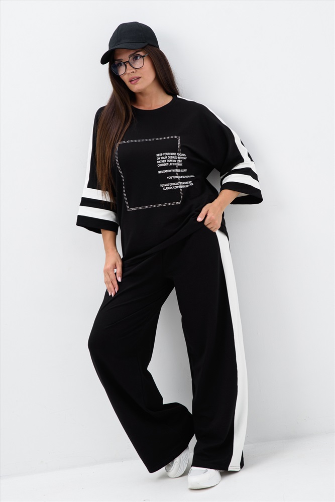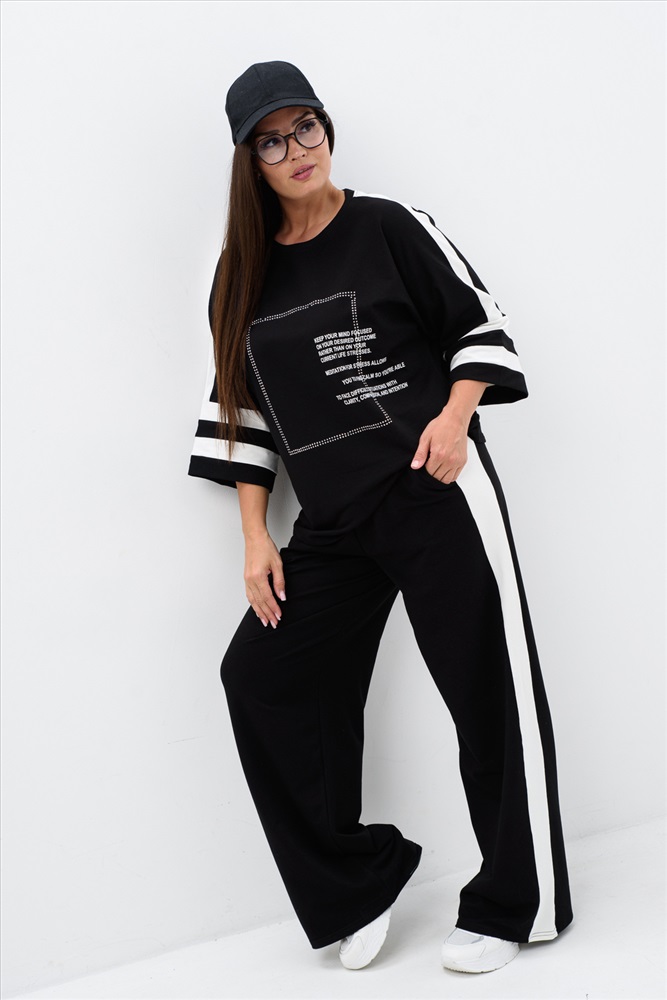 Застежка: без застежки Стильный и модный костюм из футера двунитки - идеальный выбор для вашего гардероба. Этот костюм состоит из кофты с принтом и стразами, прямых брюк. Легкий и свободный крой делает его идеальным для повседневного использования. Вы будете выглядеть стильно и молодежно, независимо от вашего возраста. Футер - это тонкий трикотажный материал, который отлично подходит для демисезонного периода. Он приятен к телу, не сковывает движения и обеспечивает комфорт в течение всего дня. Этот комплект подойдет как для отдыха на природе, так и для дома.