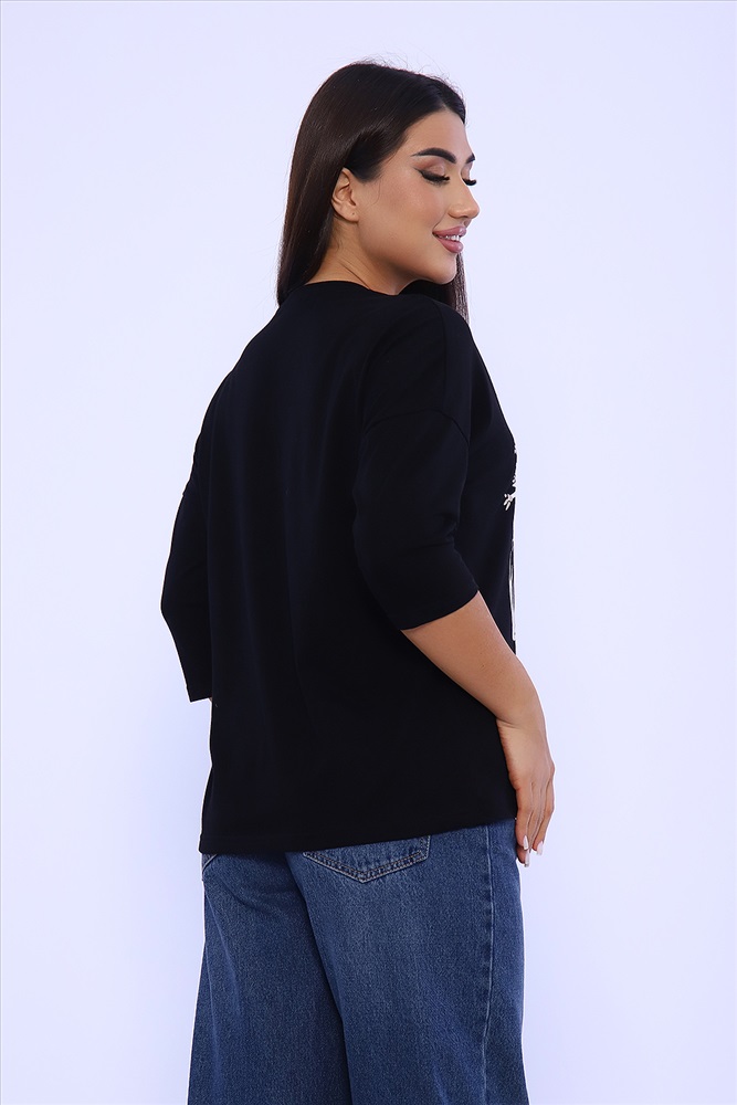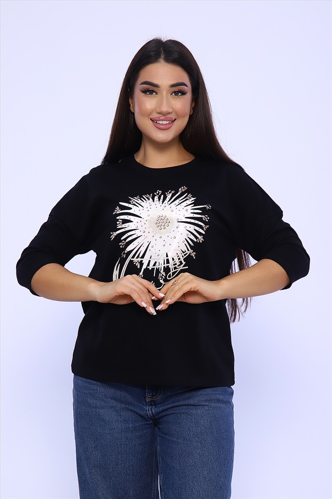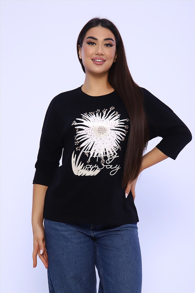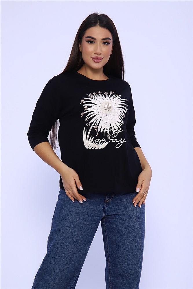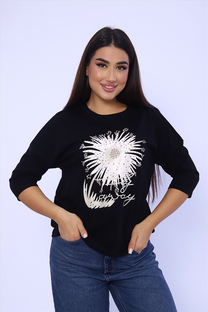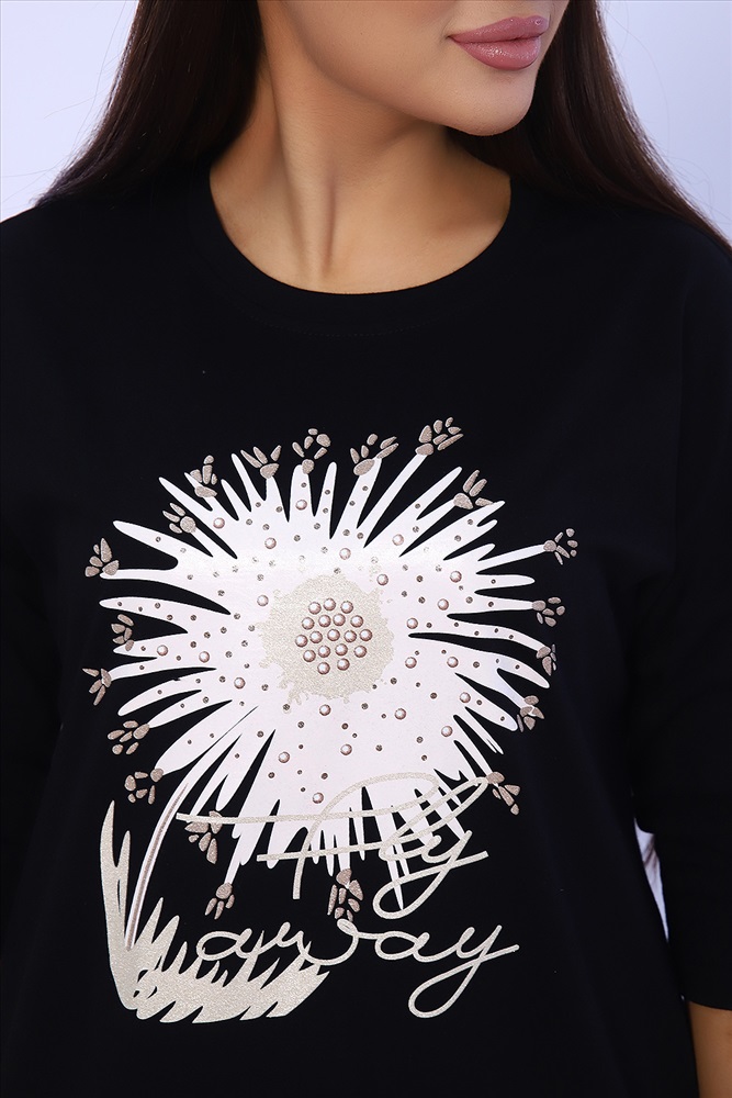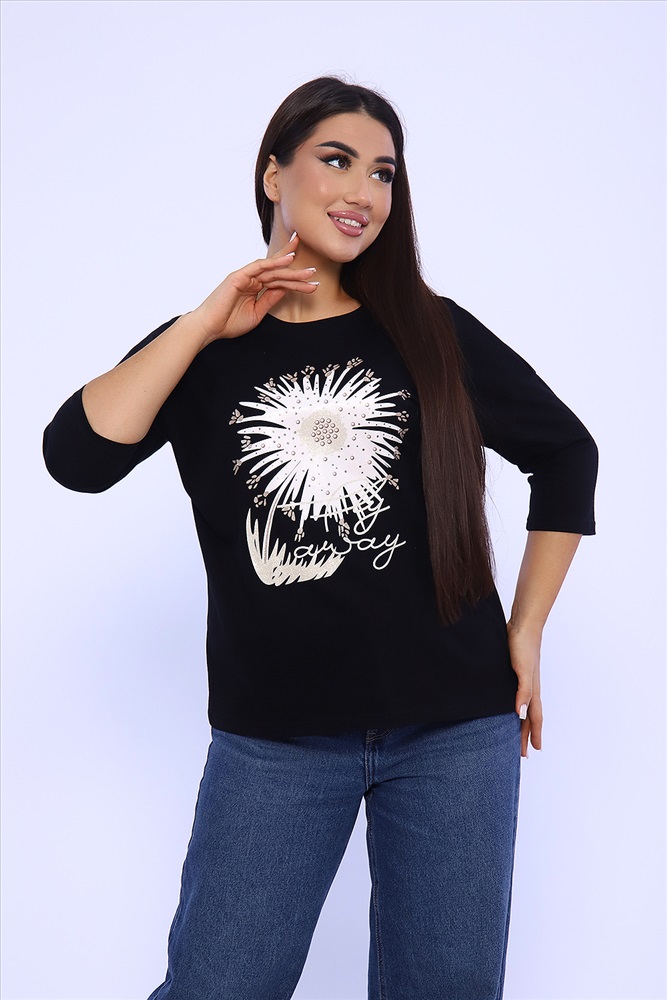 Застежка: без застежки Женский лонгслив - футболка с рукавом 3/4, изготовлена из гладкого трикотажного полотна с оригинальным принтом, разнообразит ваш ежедневный образ. Футболка будет хорошим дополнением к джинсам, брюкам. Рукав 3/4 очень актуален в любую погоду!
