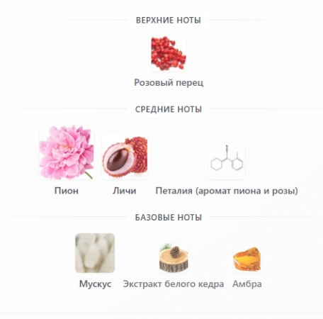 Верхняя нота: Розовый перец; средние ноты: Пион, Личи и Петалия (аромат пиона и розы); базовые ноты: Мускус, Экстракт белого кедра и Амбра