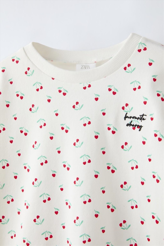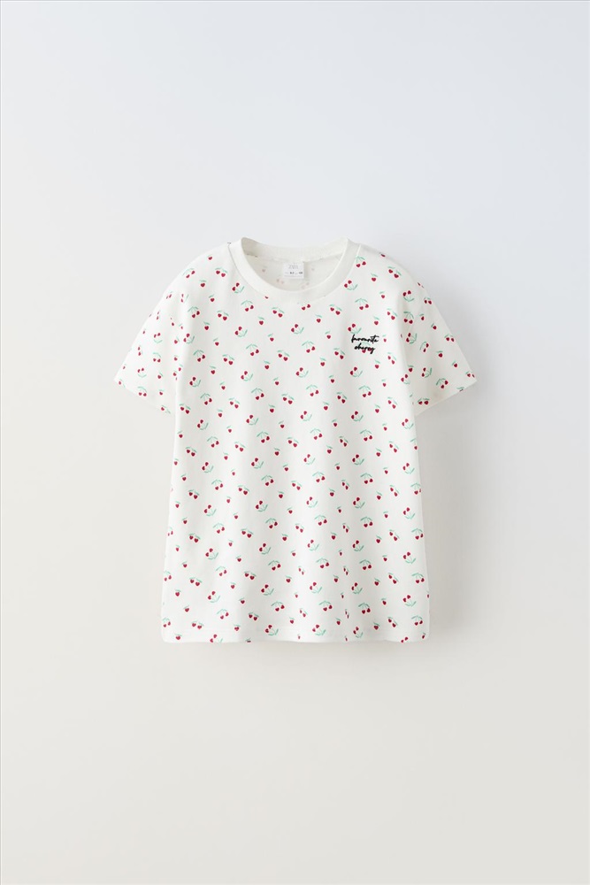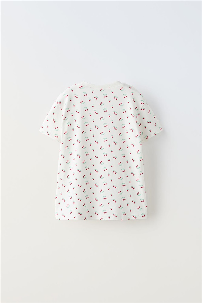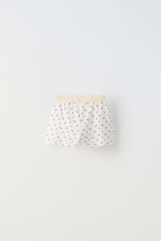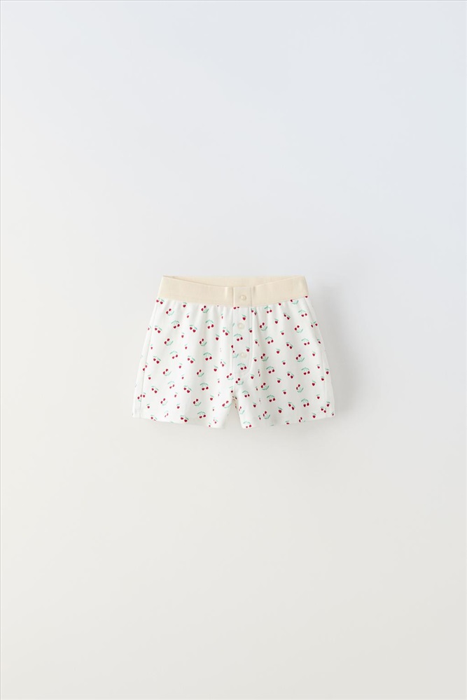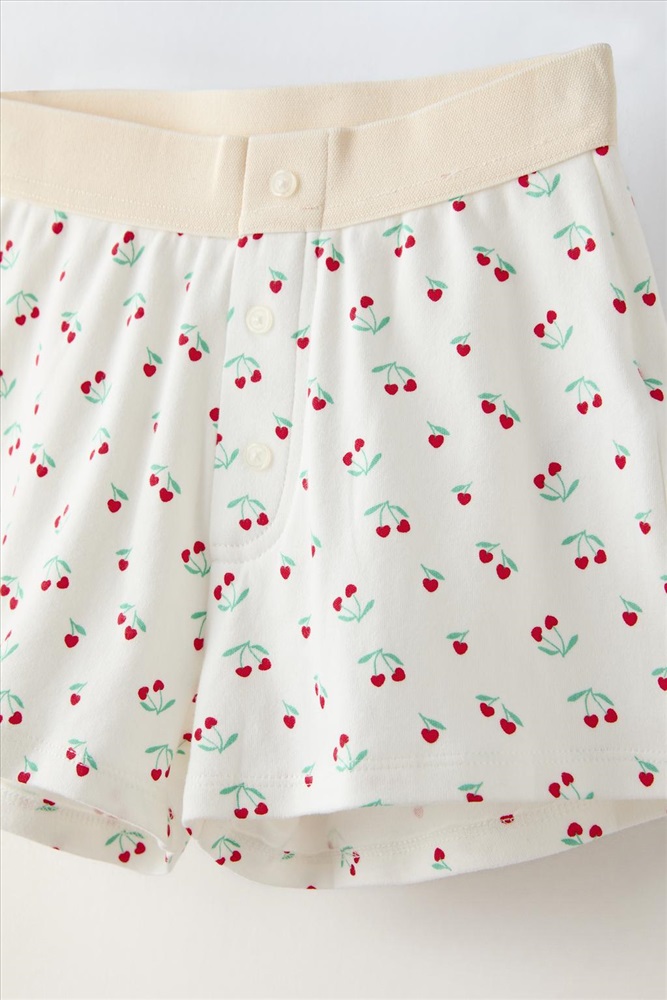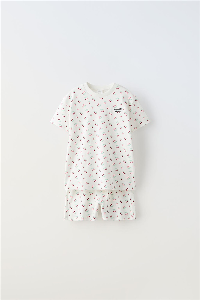 Two-piece pyjama. T-shirt with a round neck and short sleeves. Embroidered slogan on the chest. Bermuda shorts with an elasticated waistband and front button appliqués. Cherry print. COMPOSITION, CARE & ORIGIN COMPOSITION OUTER SHELL 100% cotton Which contains at least: OUTER SHELL 100% OCS certified organically grown cotton CERTIFIED MATERIALS OCS CERTIFIED ORGANICALLY GROWN COTTON This fibre is produced using no artificial fertilisers or pesticides and is grown from seeds that have not been genetically modified. We are currently working with the Organic Content Standard (OCS) that monitors the process from the source to the end product. Certified by Intertek 193341 More information CARE Caring for your clothes is caring for the environment. Lower temperature washes and delicate spin cycles are gentler on garments and help to protect the colour, shape and structure of the fabric. Furthermore, they reduce the amount of energy used in care processes.
