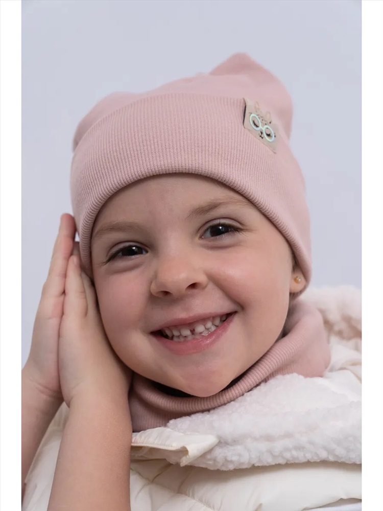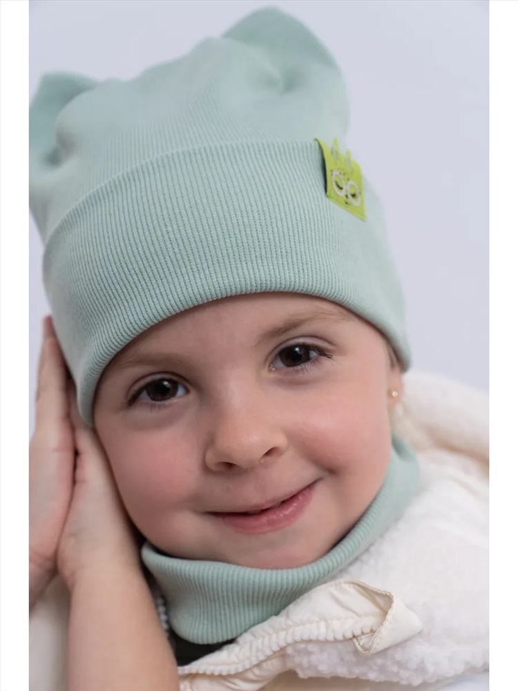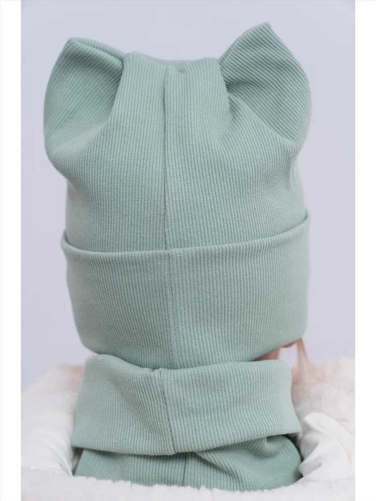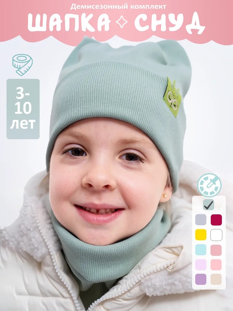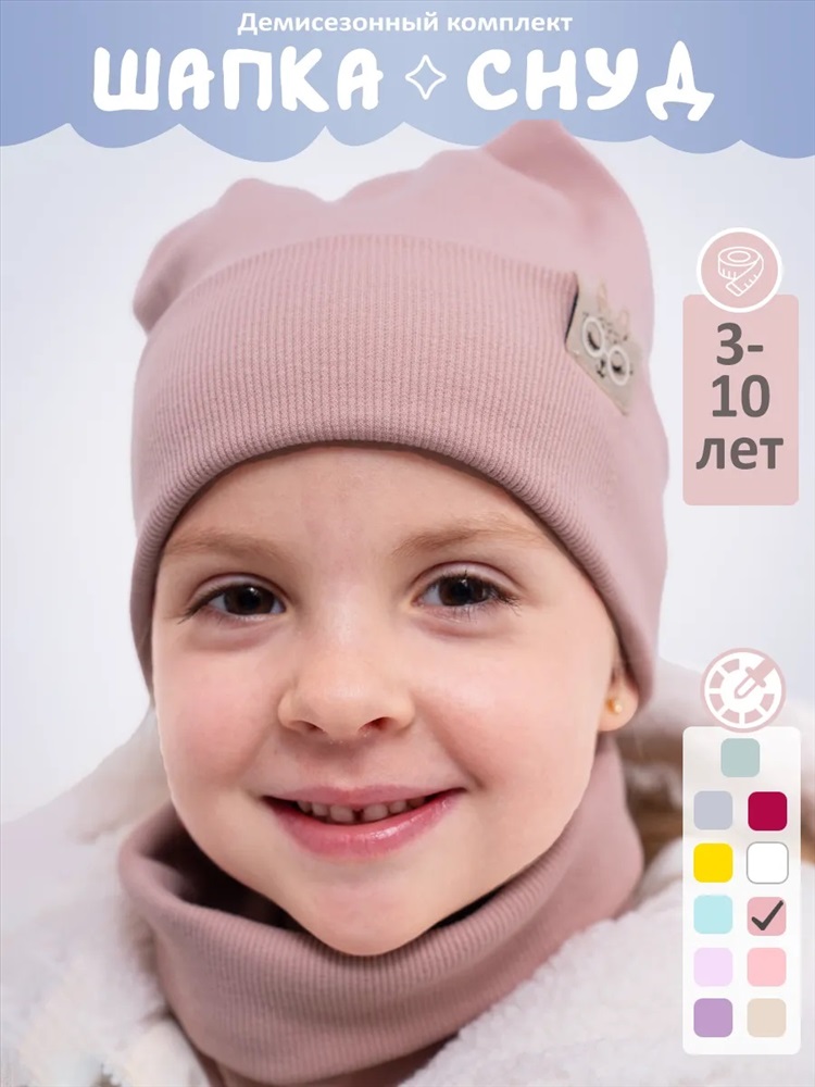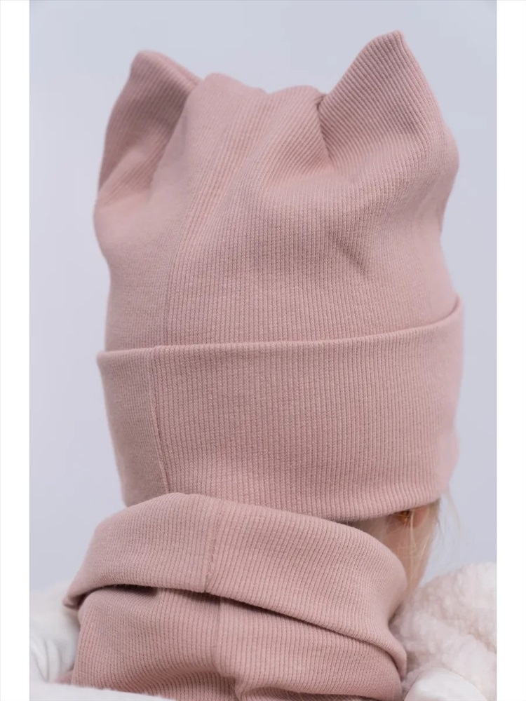 Рисунок: однотонные Шапка для девочек со снудом из двойного трикотажа идеальное сочетание стиля и уюта для прохладной погоды. Изготовлена без подкладки из высококачественного материала: 95% хлопка и 5% эластана, что обеспечивает мягкость, эластичность и комфорт. Декоративные элементы в виде ушек добавляют очарования. Снуд надежно защищает шею от холода, создавая дополнительный комфорт. Этот комплект станет отличным выбором для модных девочек, даря тепло и стиль в одном аксессуаре.