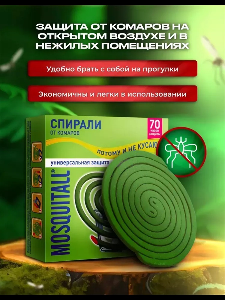 Модель: 60709 Средство от комаров Тип товара: средство от комаров Бренд: Без бренда Скидка: любая | от 10% и больше | от 30% и больше Средство для борьбы с комарами и другими кровососущими насекомыми имеет форму спирали, изготовленной из специальной пасты. Предназначены для использования на открытом воздухе: на даче, на пикнике, у водоема и в походах с целью защиты от укусов и для отпугивания летающих насекомых. Спирали от комаров москитолл универсальная защита предназначены для уничтожения комаров, москитов, мошек и других кровососущих насекомых. Действие средства начинается через 10-15 минут после начала тления спиралей от комаров. Одной спирали репеллента хватит на 10 часов активной работы на улице, веранде, на пикнике, у костра, на даче. Спирали Универсальная защита устанавливаются в разные места. Рекомендуется устанавливать спираль не ближе 1 метра от человека. При поджигании и последующем тлении ядовитый дым не позволяет комарам приблизиться к человеку, находящемуся на пикнике, в походе, на рыбалке, на террасе или веранде загородной резиденции, а также других открытых пространствах. Отпугиватель комаров устанавливается на специальную металлическую подставку, которая идет в комплекте к набору спиралей в коробке. Время полного сгорания спирали 6-7 часов. В любой момент спираль можно затушить и зажечь снова когда придет время. Хранить спирали следует аккуратно, в заводской упаковке. При работе прибора нельзя трогать спираль руками и металлическими предметами. С осторожностью следует применять средство инсектицидное при детях до 3 лет и при людях с заболеваниями дыхательных путей и склонных к аллергии. Диаметр спирали: 11 см. Количество спиралей: 10 шт в коробке х 2 коробки Размер подставки: 5 см х 3,5 см х 0,1 см. Таблица размеров и веса