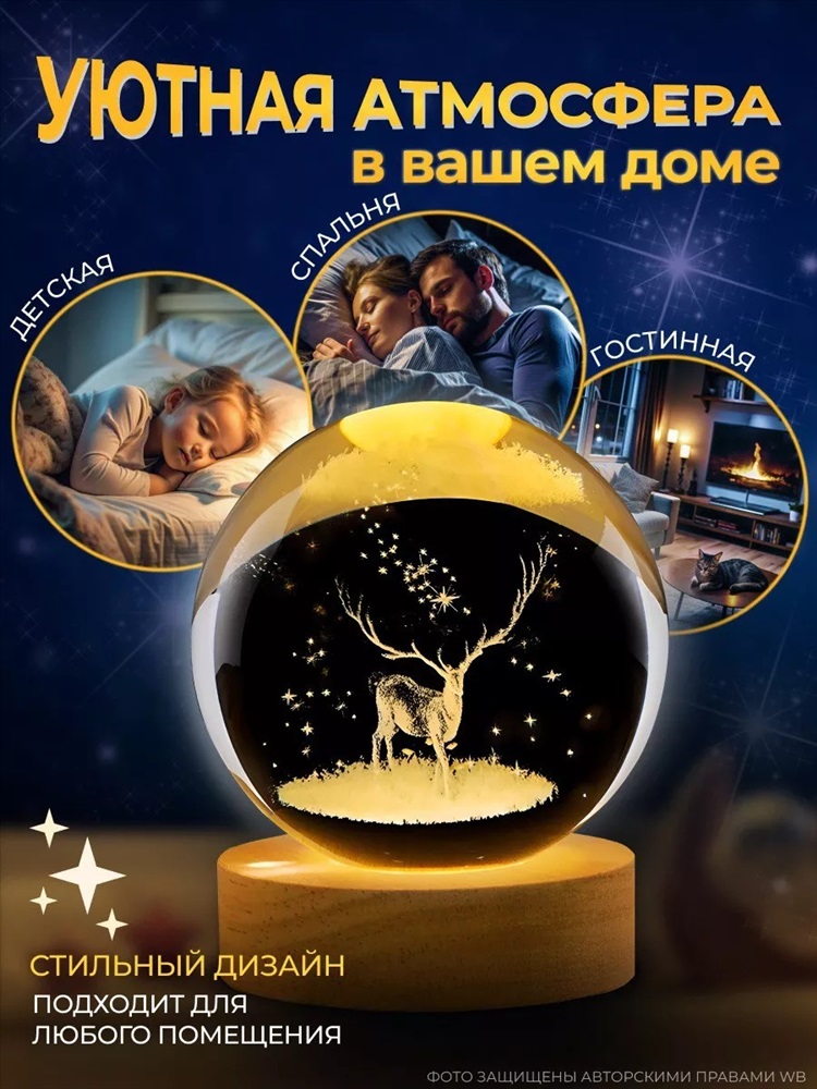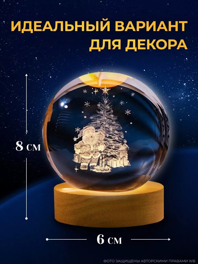 Модель: 61056 Светильник новогодний 3D Тип товара: ночник Бренд: Без бренда Светильник Стеклянный Шар без музыки - это не просто ночник, а настольная лампа, которая создает атмосферу спокойствия и уюта. Детский ночник идеально подходит для тех, кто хочет расслабиться и настроиться на сон. Ночник станет отличным дополнением для вашего дома или дачи. Он оснащен деревянным основанием, из которого исходит свет, подсвечивая узоры на стеклянном шаре. В темноте он выглядит волшебно и очень красиво, создавая уютную атмосферу в комнате и становясь прекрасным декором для интерьера. ночник луна шар изготовлен из экологически чистых и гипоаллергенных материалов - дерева и стекла, а его декор выполнен в виде лазерной гравировки внутри стеклянного шара. Благодаря своим миниатюрным размерам, этот 3D светильник идеально подойдет для украшения детской комнаты, спальни или кабинета. Ночник луна левитирующая выполняет свою основную функцию, создавая мягкий рассеянный свет, который не раздражает глаза и помогает расслабиться перед сном. Благодаря современной технологии, светильник не имеет пульсаций света, а его освещение является ровным и приглушенным, что идеально подходит для комфортного сна или ночной подсветки. Подключение светильник к питанию осуществляется через USB-кабель, который идет в комплекте (длиной 100 см). !Важно отметить, что адаптер с USB-разъемом в розетку не входит в комплект! Диаметр шара составляет 6 см, а сам светильник не нагревается во время работы. В комплекте вы получите один шар и одну подставку с подсветкой. В ассортименте новогодние варианты светильников. Таблица размеров и веса