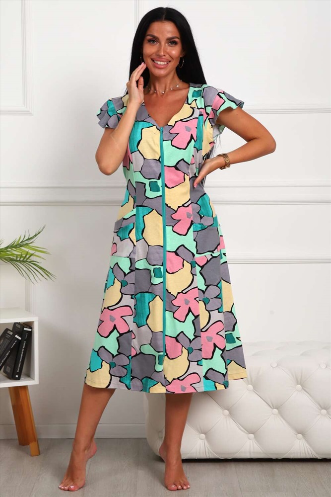 Застежка: молния Легкий женский халатик из натурального трикотажа. Приталенный с поясом в боковых швах. Удобные накладные карманы. Расклешённый к низу. Длина миди. Игривый рукав крылышко. Горловина V-образной формы. Для более комфортной посадки на фигуре, на полочках и спинке рельефные швы. Застежка на тесьму молнию.