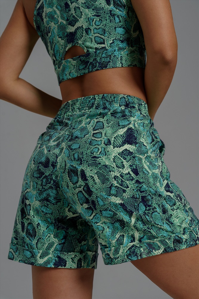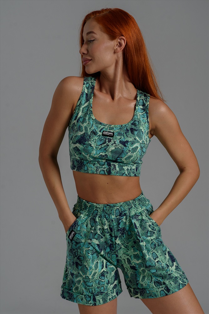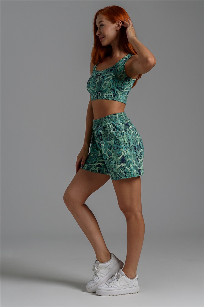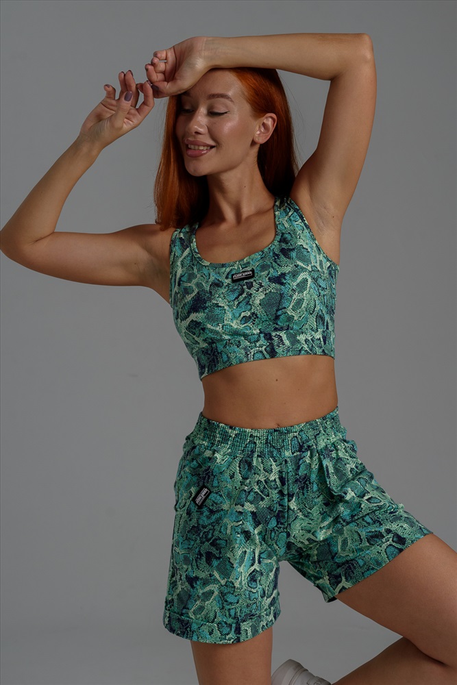 Воротник: без воротника Комплект состоит из топа и шорт. Топ на узких бретелях, с округлой горловиной на полочке и вырезом борцовка сзади. Горловина, проймы и вырез на спинке обработаны бейкой из основного полотна. Шорты на поясе, свободные, с боковыми карманами, с декоративными отворотами по низу. В верхней части передних половинок по шву притачивания пояса расположены складки.