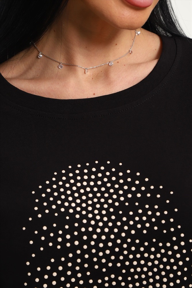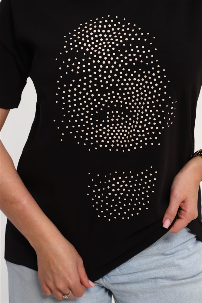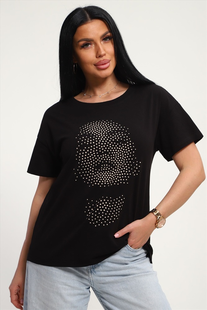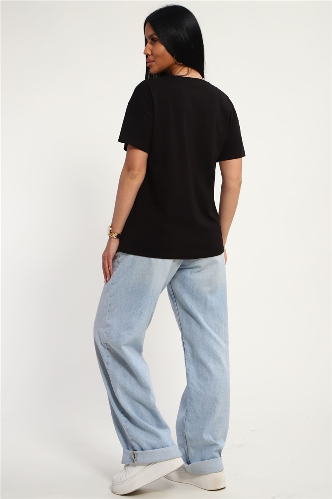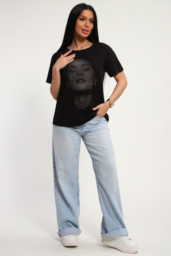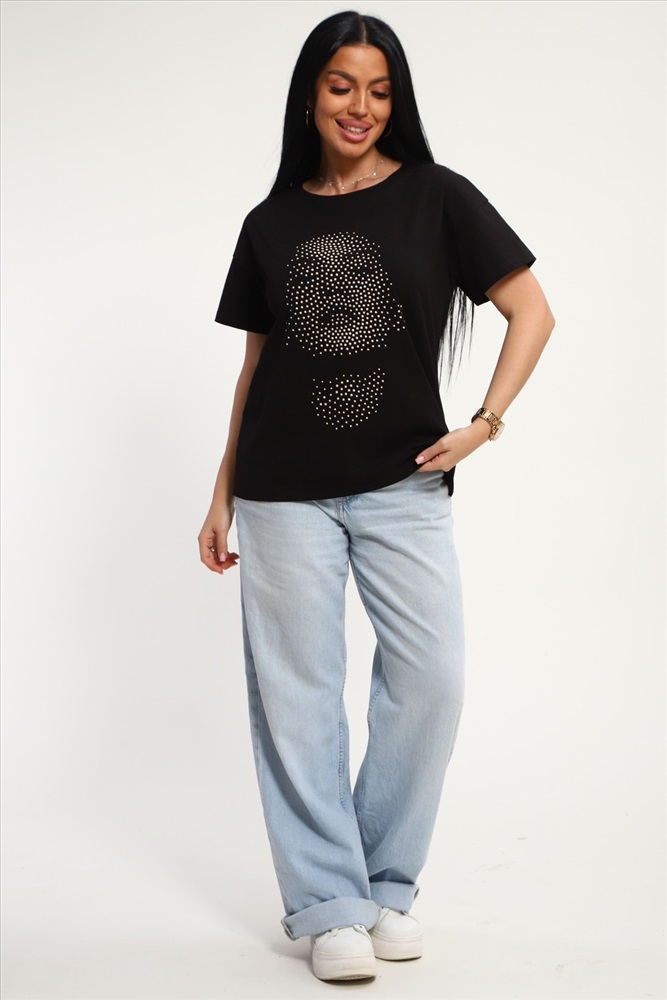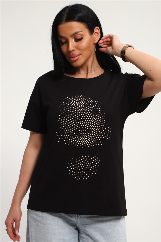 Застежка: без застежки Футболка женская из гладкокрашенного трикотажа, хлопок 100%. Прямого силуэта, свободного облегания. горловина круглой формы. Рукав короткий. Низ изделия прямой. На полочке принт, шелкография.
