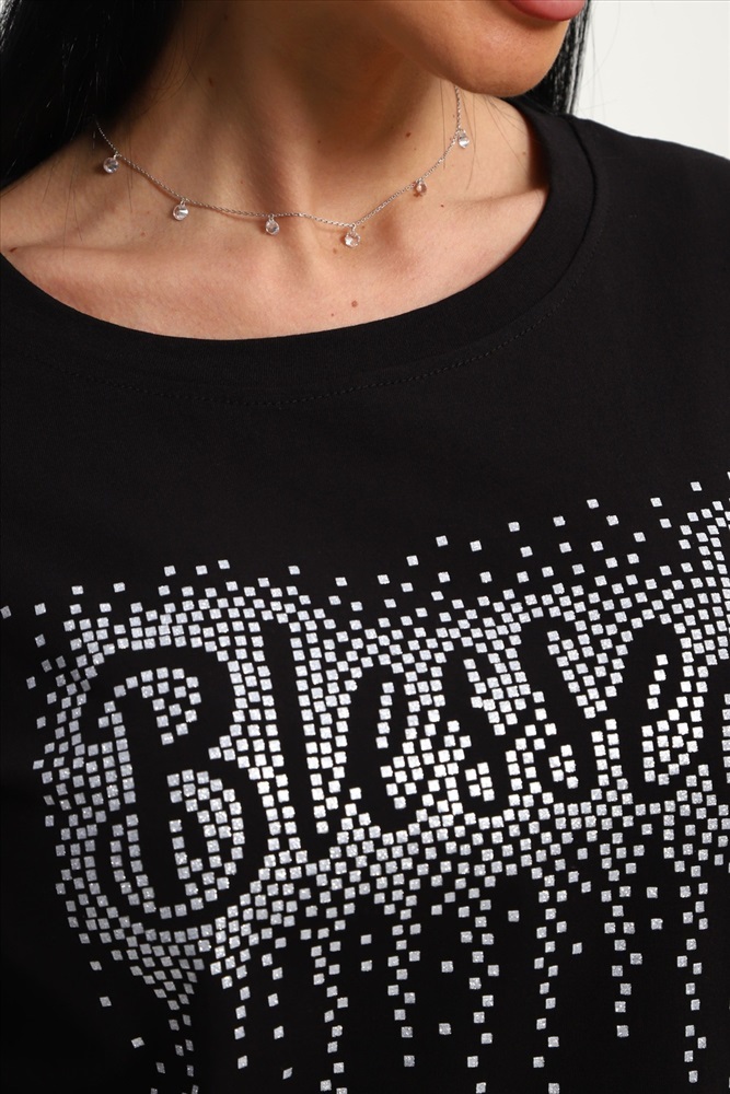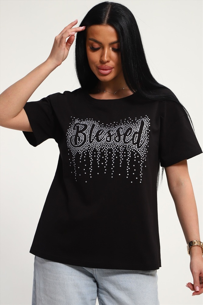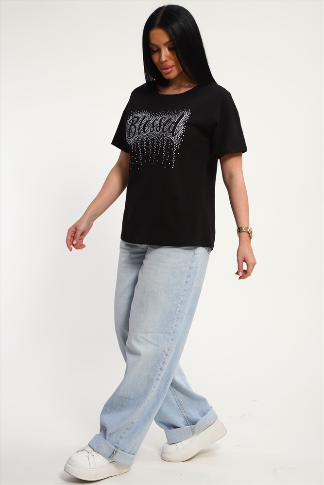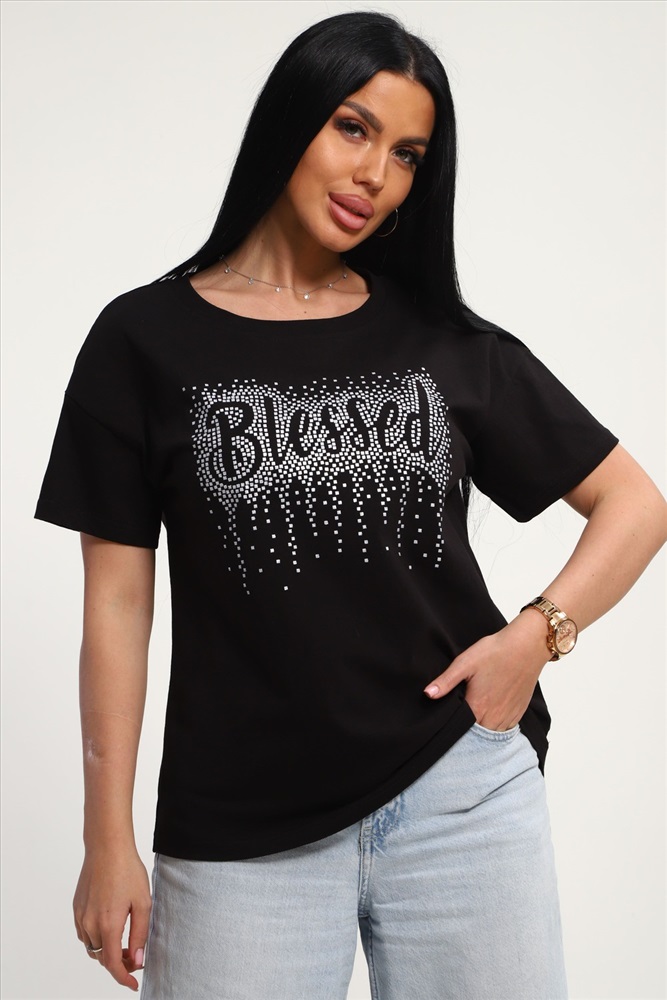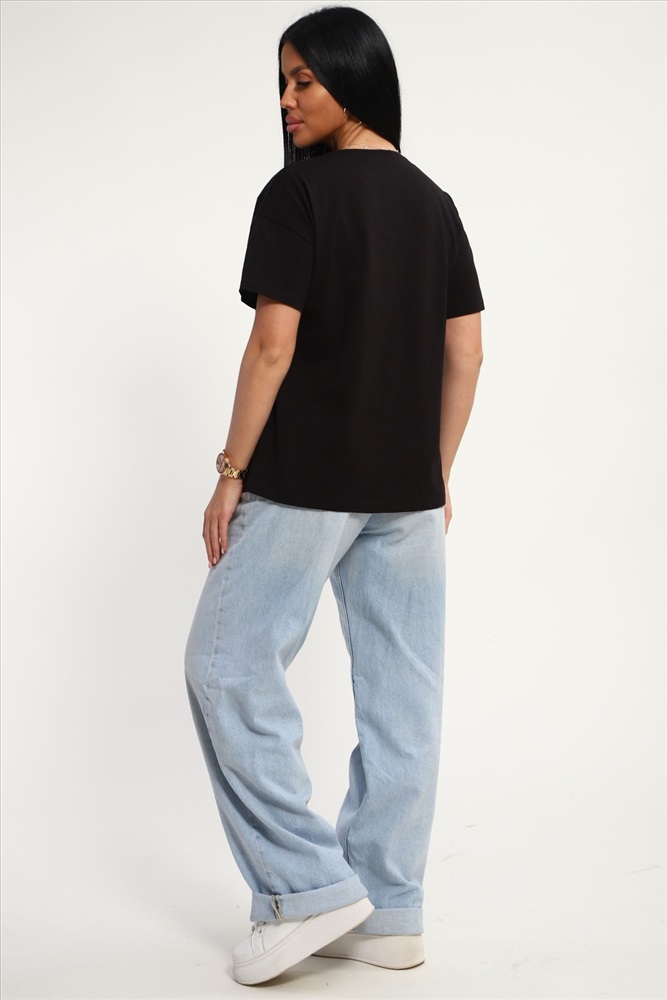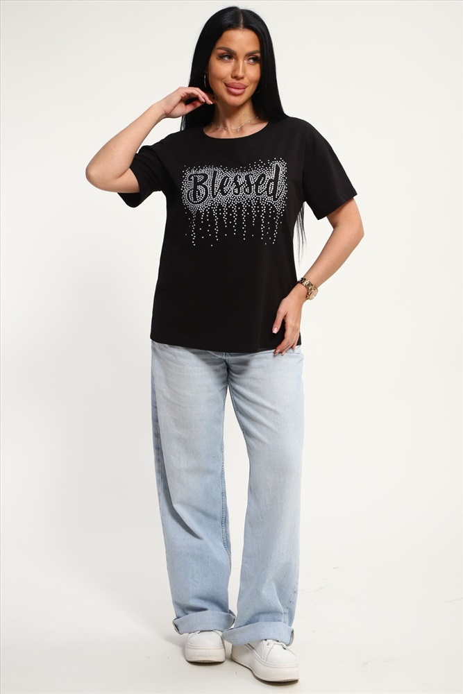 Застежка: без застежки Футболка женская из гладкокрашенного трикотажа, хлопок 100%. Прямого силуэта, свободного облегания. горловина круглой формы. Рукав короткий. Низ изделия прямой. На полочке принт, шелкография.