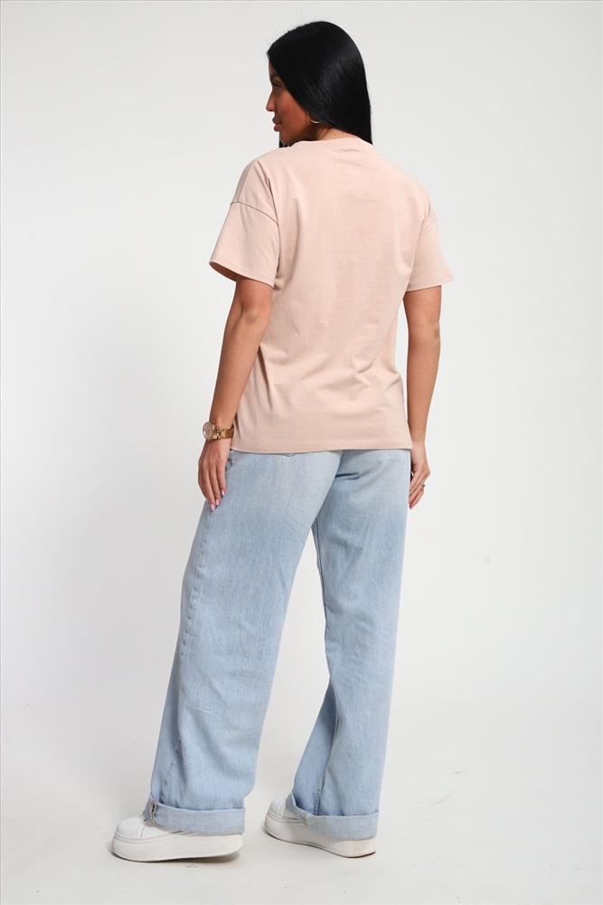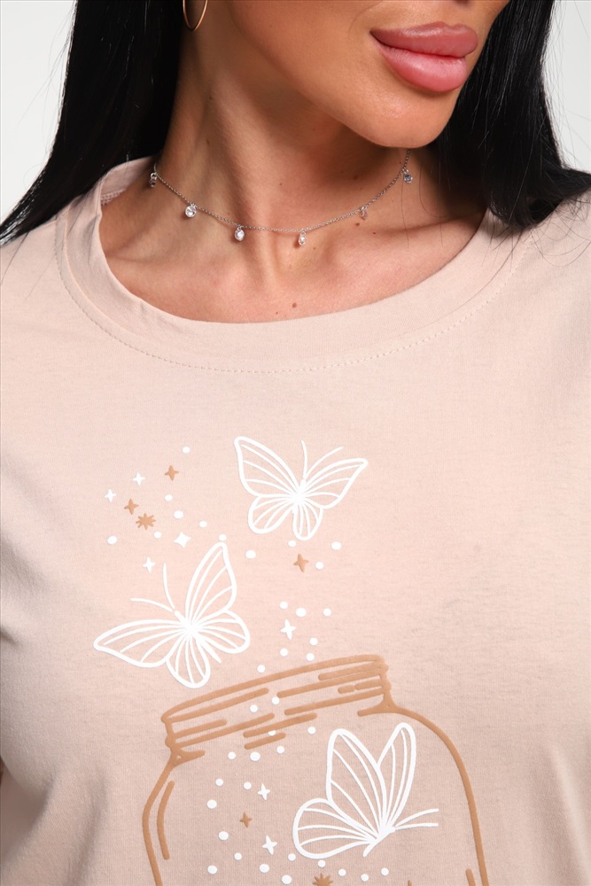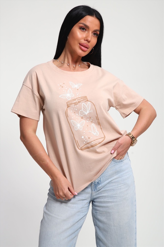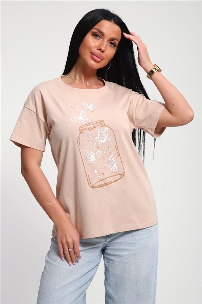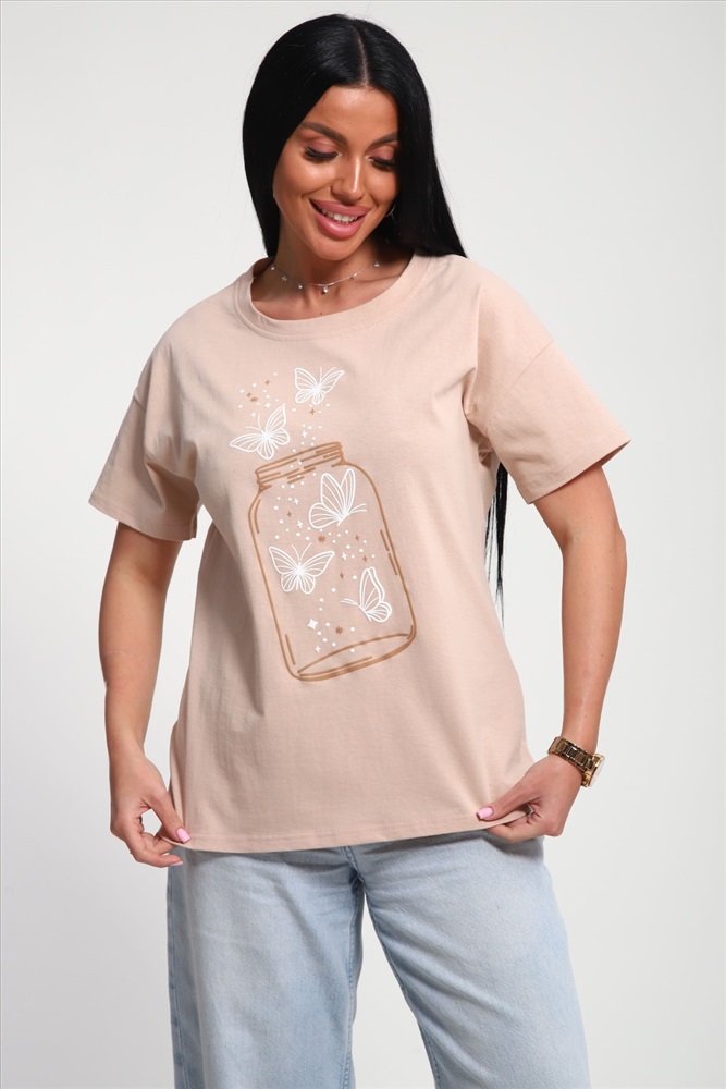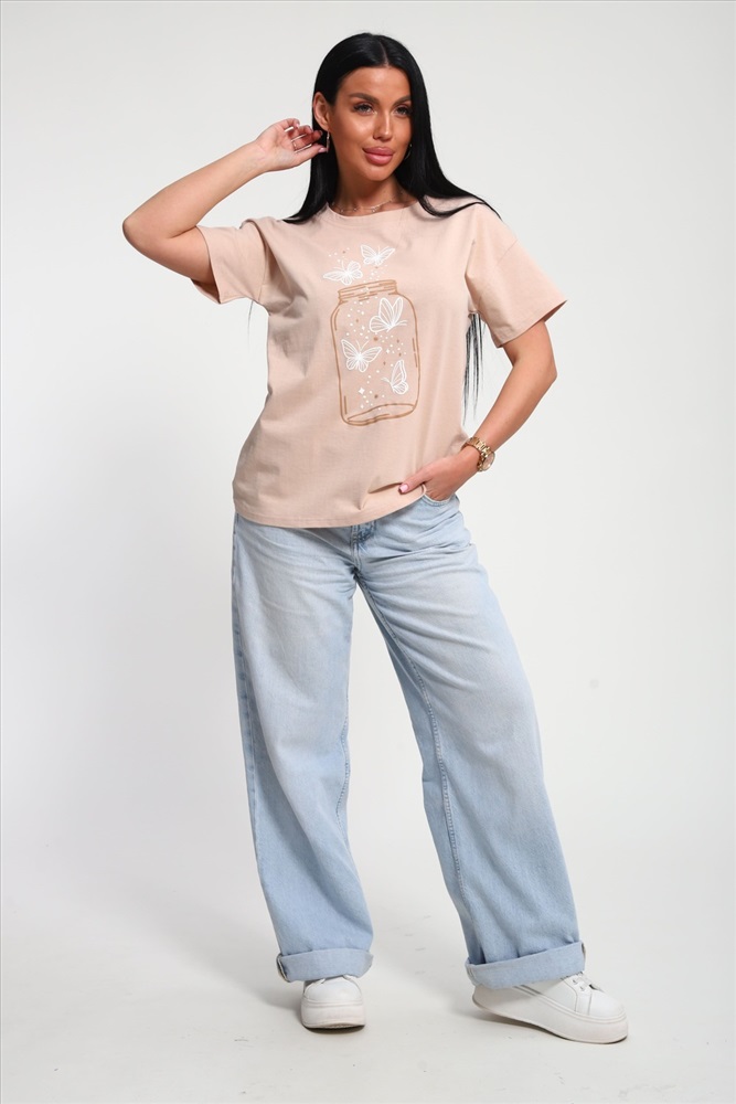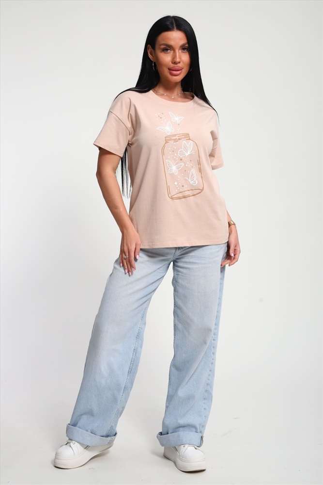 Застежка: без застежки Футболка женская из гладкокрашенного трикотажа, хлопок 100%. Прямого силуэта, свободного облегания. горловина круглой формы. Рукав короткий. Низ изделия прямой. На полочке объемный принт, шелкография.