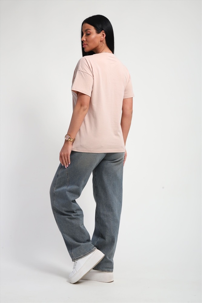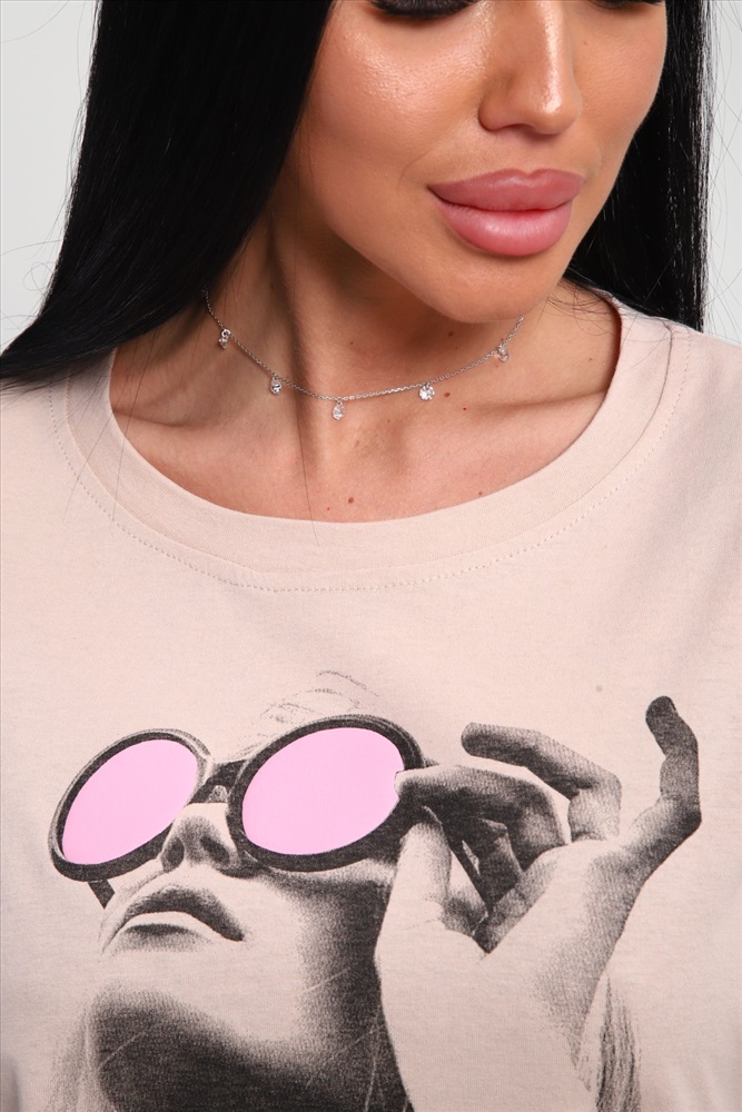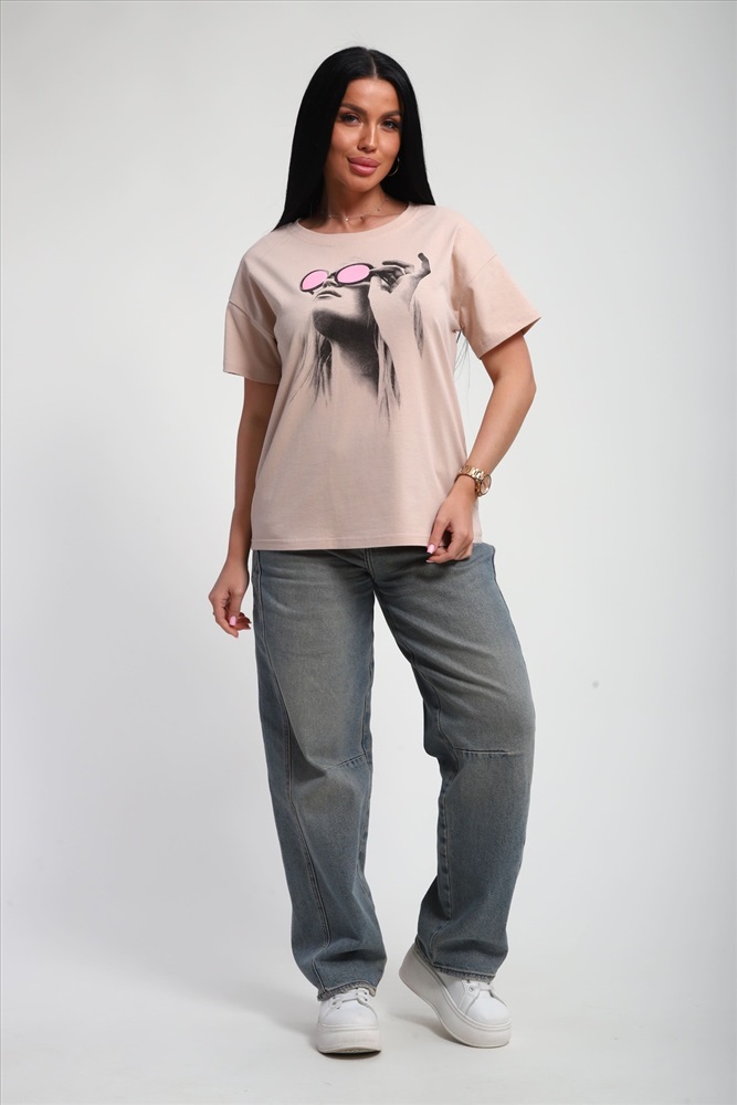 Застежка: без застежки Футболка женская из гладкокрашенного трикотажа, хлопок 100%. Прямого силуэта, свободного облегания. горловина круглой формы. Рукав короткий. Низ изделия прямой. На полочке объемный принт, шелкография.
