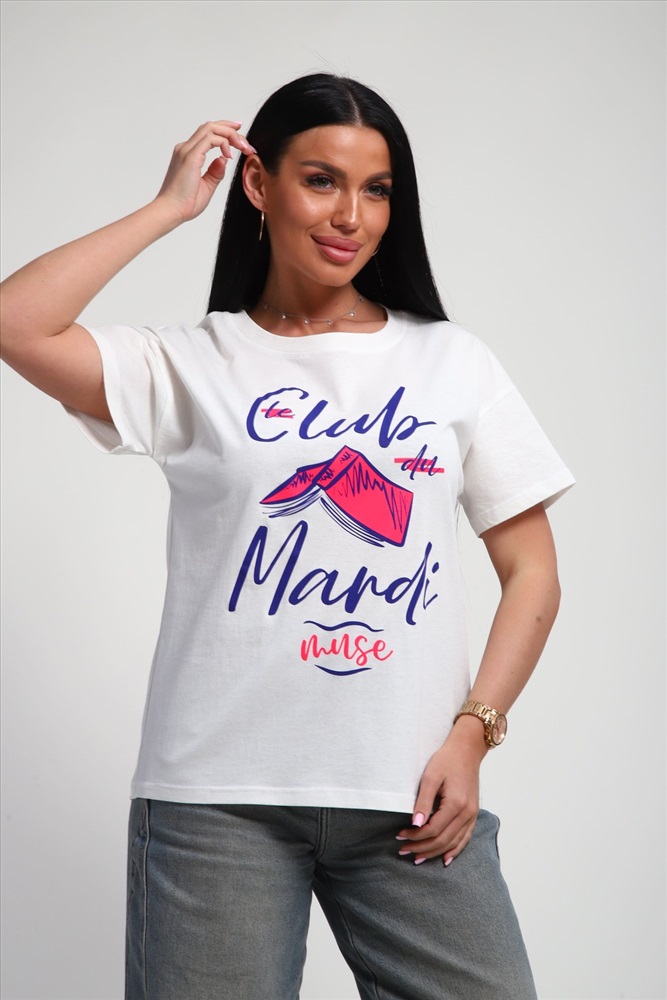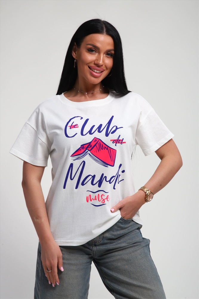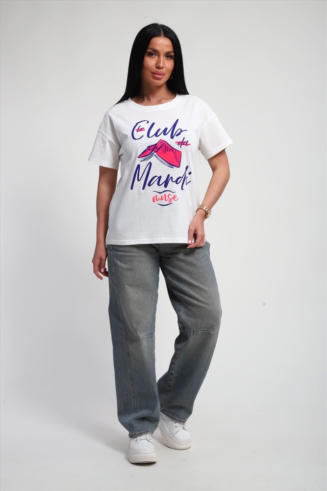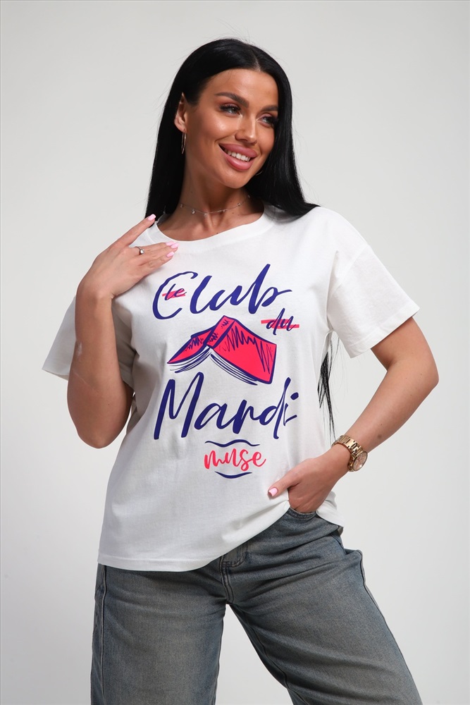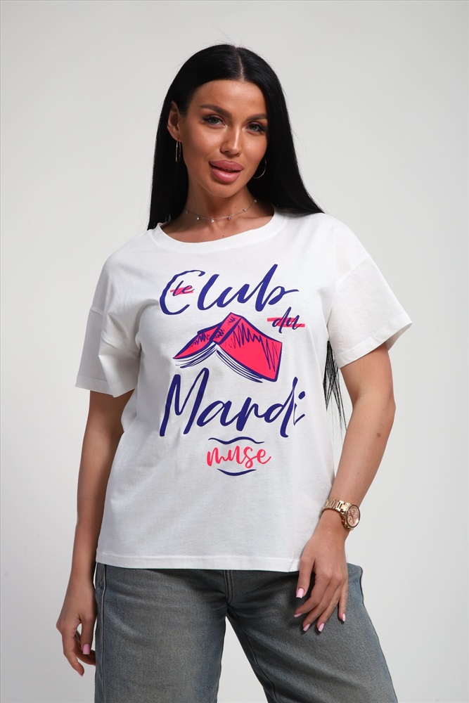 Застежка: без застежки Футболка женская из гладкокрашенного трикотажа, хлопок 100%. Прямого силуэта, свободного облегания. горловина круглой формы. Рукав короткий. Низ изделия прямой. На полочке принт, шелкография.