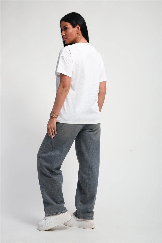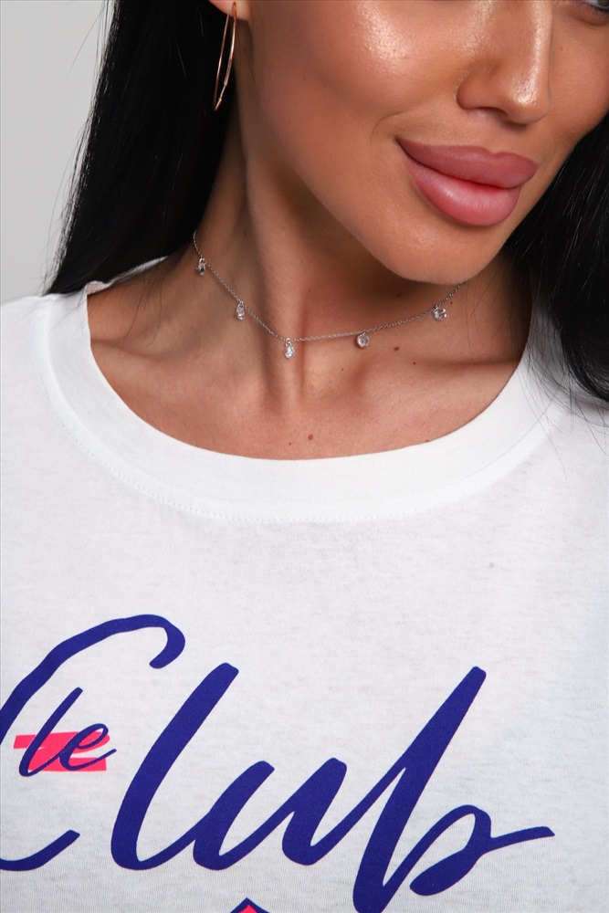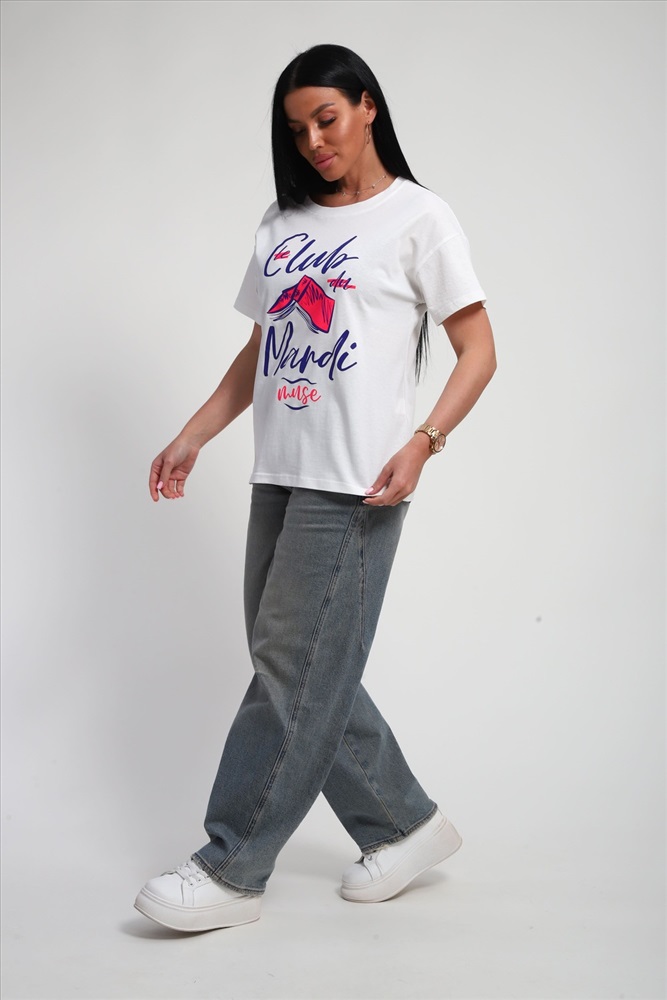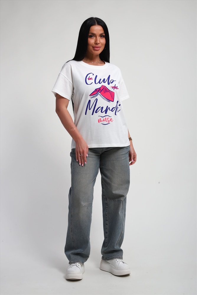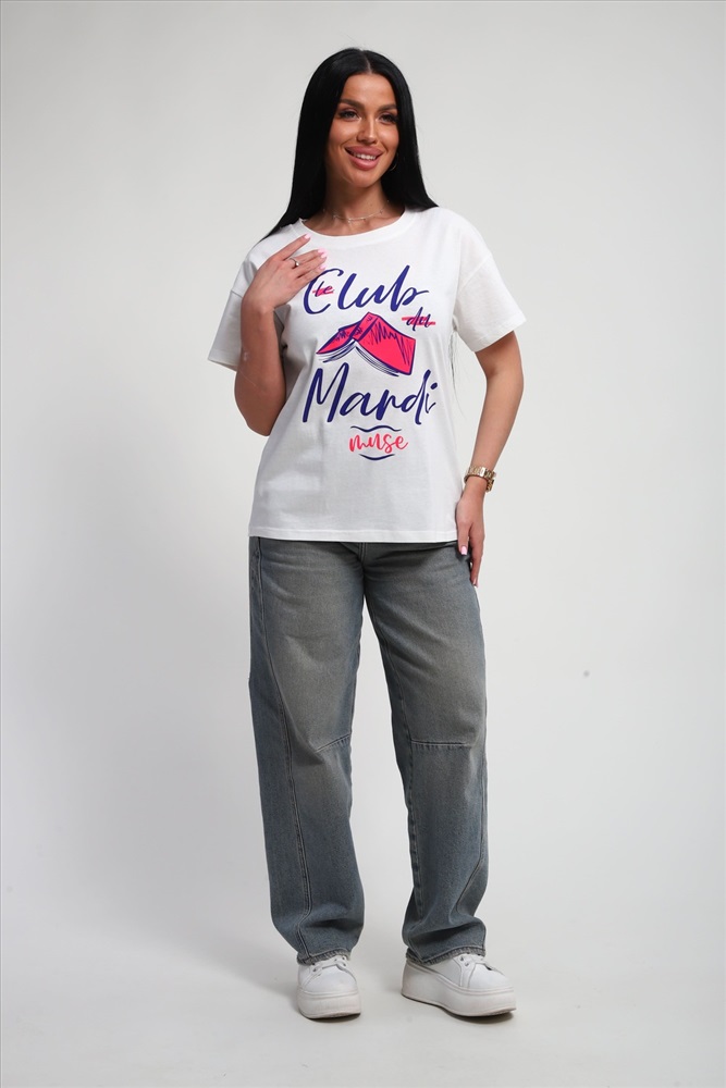Застежка: без застежки Футболка женская из гладкокрашенного трикотажа, хлопок 100%. Прямого силуэта, свободного облегания. горловина круглой формы. Рукав короткий. Низ изделия прямой. На полочке принт, шелкография.